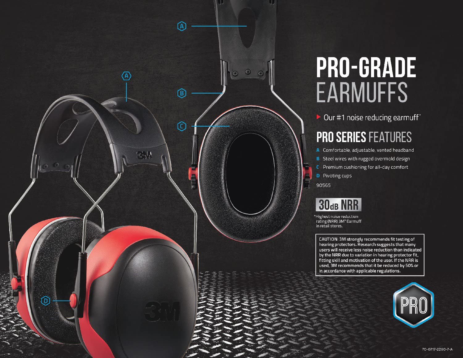 3M™ Pro Grade Earmuff offers superior comfort and protection. The 3M™ Pro Grade Earmuff is designed to be a high noise reducing/protection earmuff. Adjustable, vented headband design reduces heat build and improves comfort when worn with hats. Part of the 3M™ Pro Series Safety Products line that was designed for the way pros think, the way they shop and the way they work