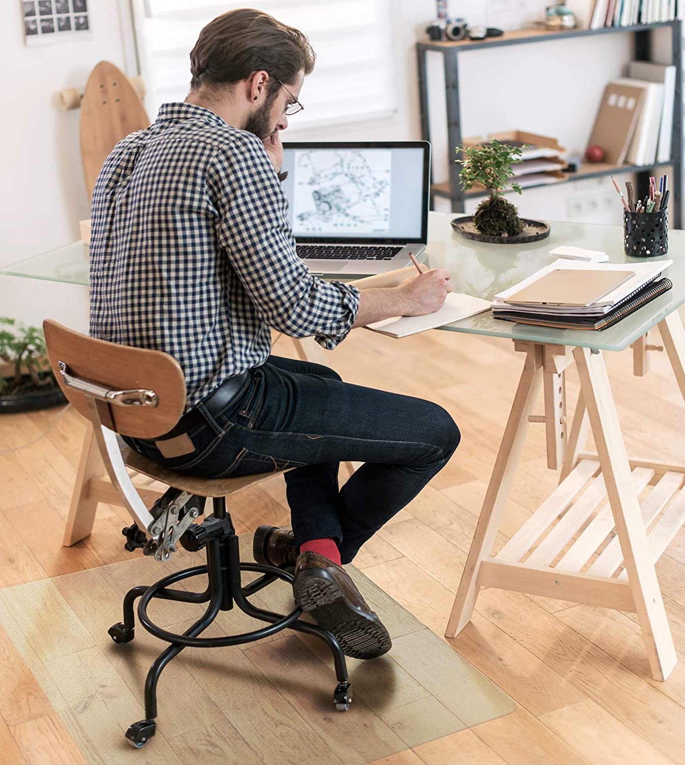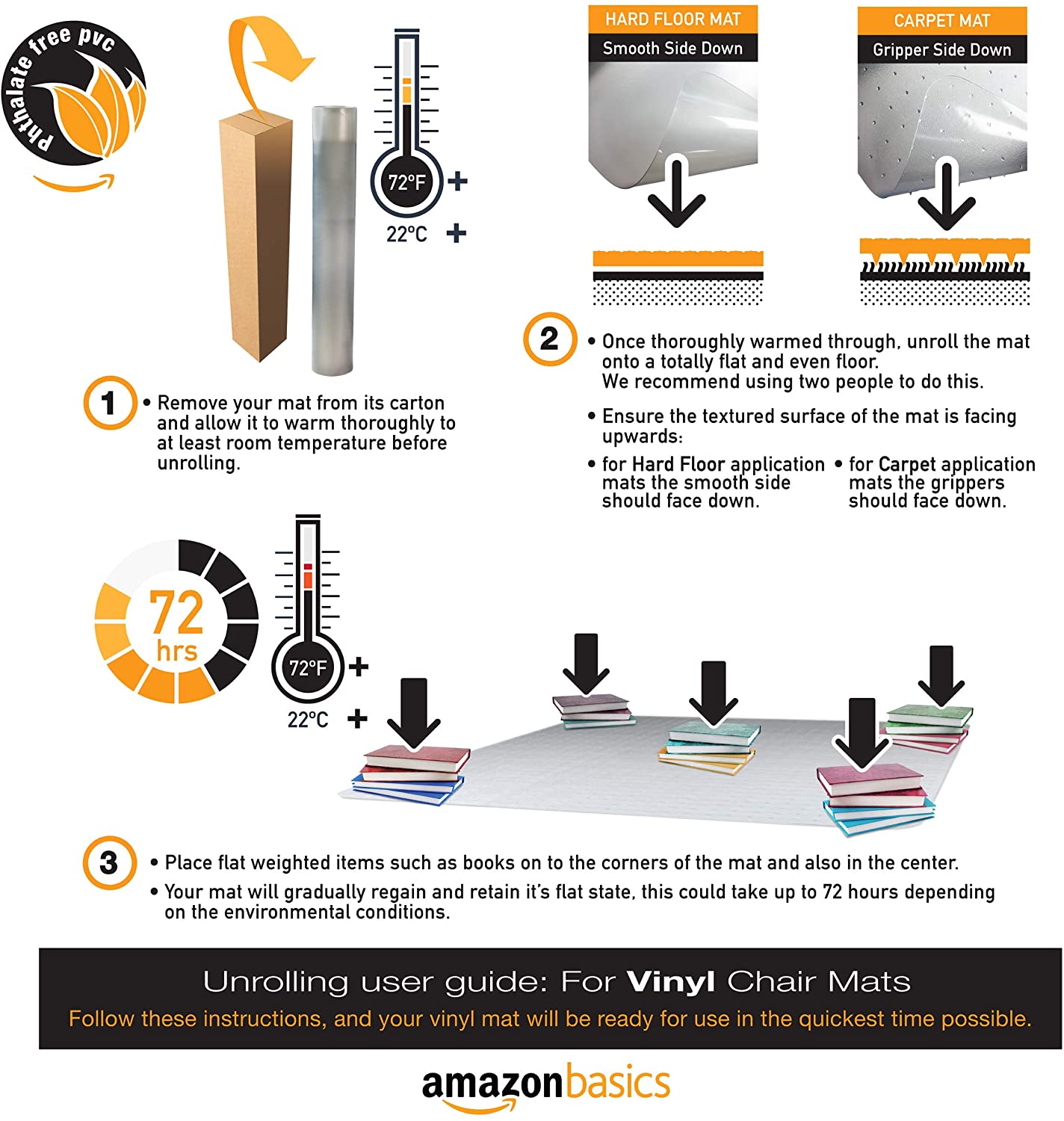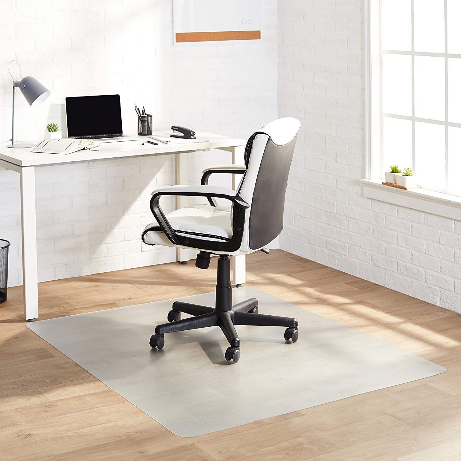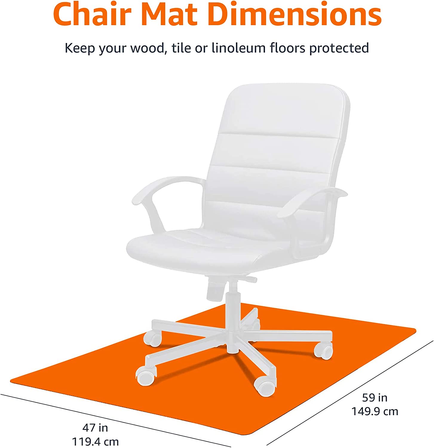 - Durable vinyl chair mat for protecting hard floors from damage caused by desk chair wheels or feet; protects laminate, hardwood, vinyl, stone, tile, and concrete
