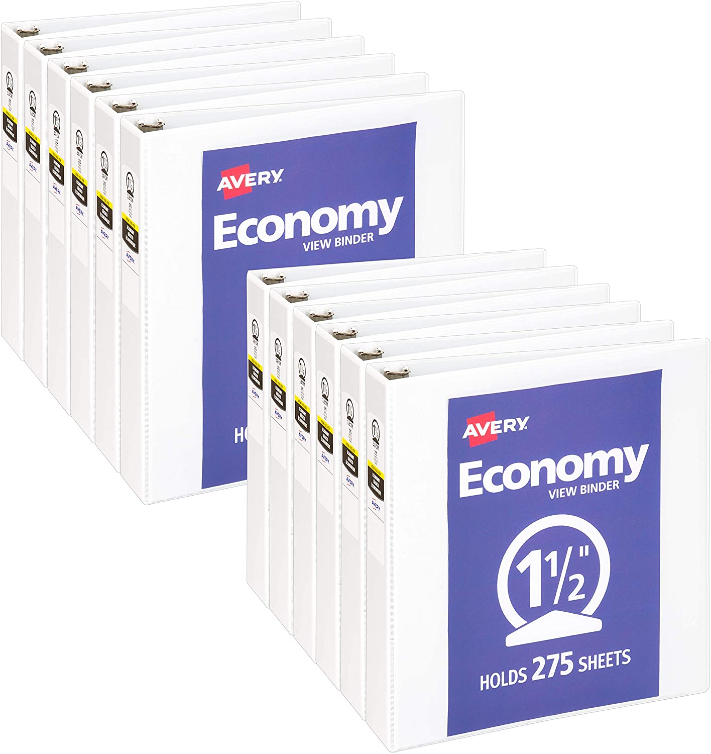Avery 1.5 inch Economy View 3 Ring Binder, Round Ring, Holds 8.5″ x 11″ Paper, 12 White Binders (05726)