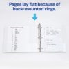 - Pages lie flat because rings are mounted on the rear binder panel instead of on the spine