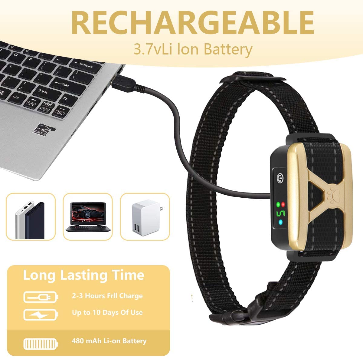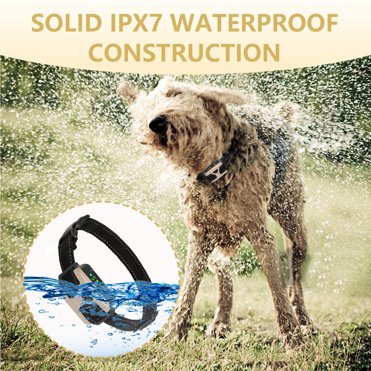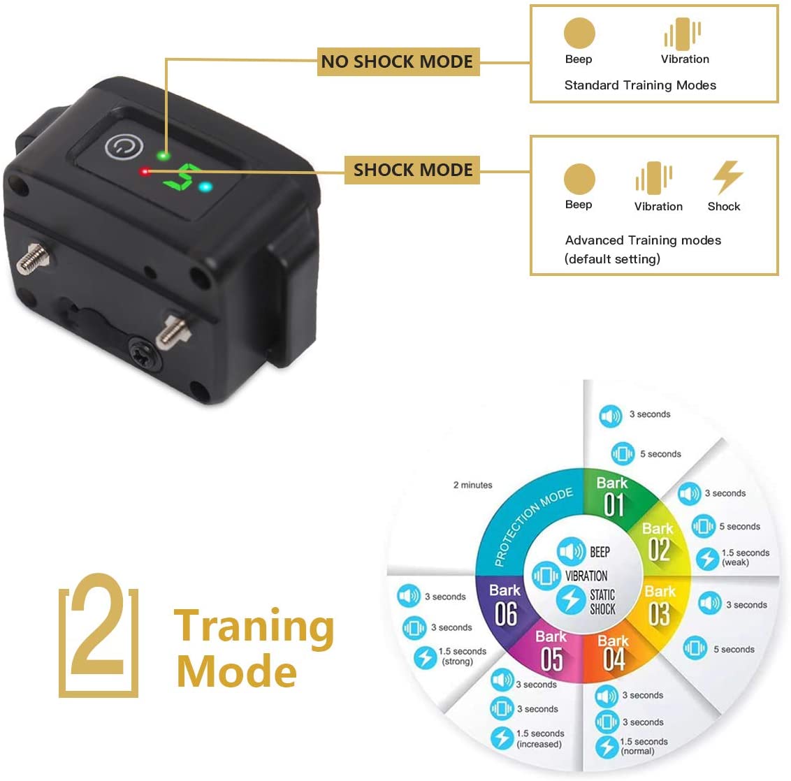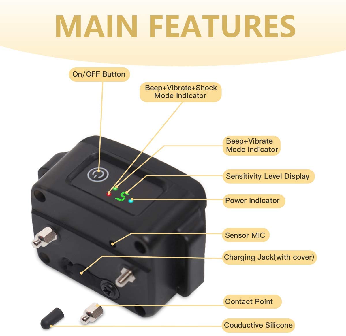 About this item No-Shock Mode: Press the shock setting button to adjust the level to”0″, suitable for dogs under 55 lbs. Double Safe: 2 activation conditions, Bark and vibration from vocal cords. Two Silicone Sleeves can protect the dog’s skin from damage. Bark collar with 5 intensity levels and 3 sensitivity levels. There are 3 test training modes of beep, vibration and shock, providing a variety of training methods. Dog barking collar is rechargeable. It gets charged in only 2 hours and works about 14 days with 1 battery life. USB cable comes with the device. With collar straps, the size can be adjusted freely. Suitable for dogs 8-110 lbs. The bark collar is resistant to rain, snow and mud splashes. You can walk with your pet indoors and outdoors in any weather.