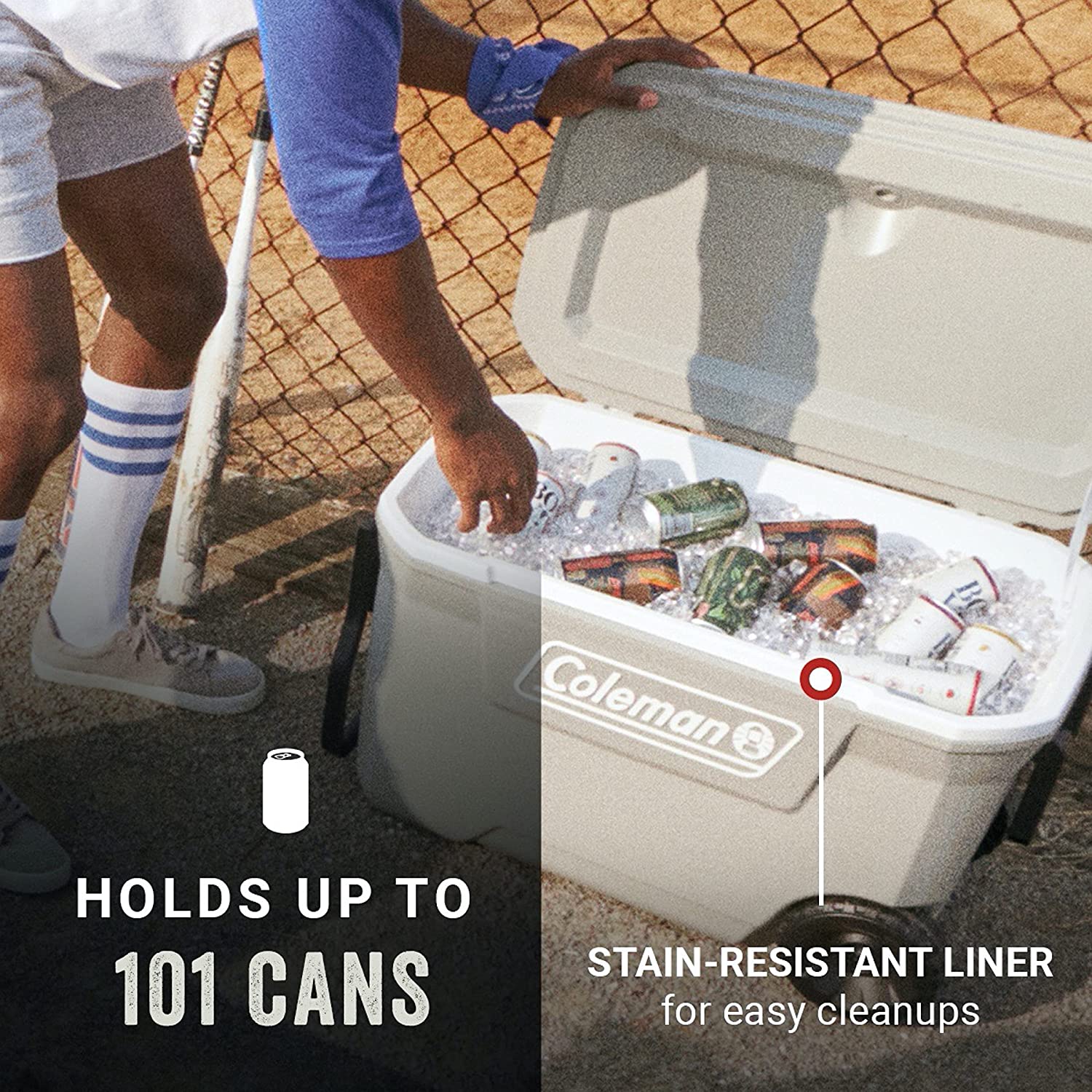 FULLY INSULATED: Lid and body Keeps the Ice up to 5 days in temperatures as high as 90°F; logo color on cooler may vary FOR THE LONG HAUL: Heavy-duty 6-inch wheels and durable tow & swing-up handles designed for easy transport CUP HOLDERS WITH DRAIN: Molded into the lid to keep drinks from spilling; fit up to a 30-oz. tumbler HAVE-A-SEAT LID: Closed lid supports up to 250 lbs. STAIN-RESISTANT LINER: For easy cleanup; leakproof channel drain plug EASY TO OPEN: Recessed lip for easier access to contents LARGE CAPACITY: Holds up to 101 cans LEAKPROOF: Channel drain plug