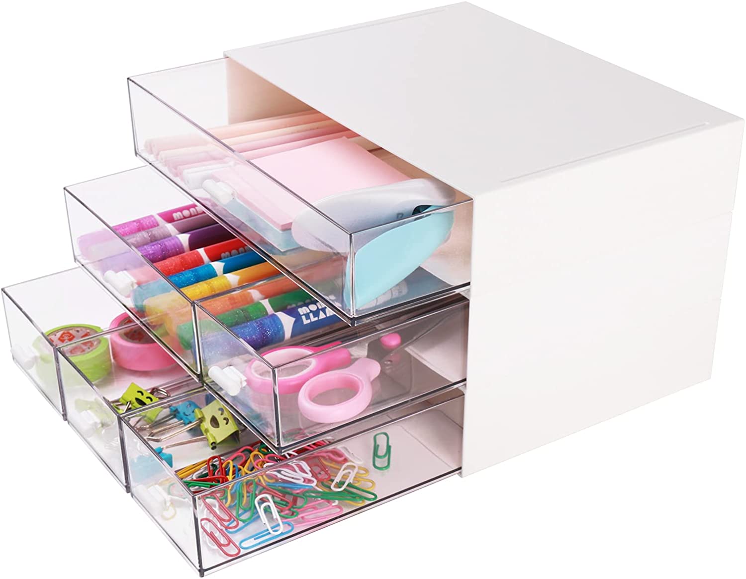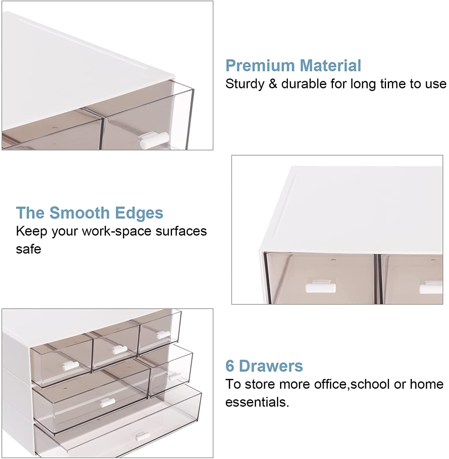 Stay Organized: Comix desk supplies organizer, which has 6 drawers provide enough space to well organized your pens,make good use of your desk space and keep everything in order and easy to access. Plastic 6 Drawers Desk Organizer: This stationery storage box made of non-toxic ABS material, which does not cause any harm. It is strong and solid enough for a long time using and silicone handle make opening and closing drawers simple and easy. What’s more, this drawer desk organizer can be used alone or configured in any type to statified you need. Multipurpose Desk Storage Holder: This desk organizer can be use for storing and displaying desktop stationery like pen,pencil,maker,crayons,eraser,paper clip,pins,rubber bands,scissor,letter opener…but also great for sorting storing your makeup brushes,nail polishes,lipstick and other small personal essentials.It’s suitable for Home/Office Perfect Size: With 8.97 “L x 6.49” W x 5.9 “H size,this desk organizer is pretty perfect size for many rooms throughout your home; Great for small spaces – college dorms, apartments, condos, RVs, and campers; Use this convenient unit to add storage wherever you need it – A beautiful and excellent organizer that keeps your desktop clean and tidy. 100% Statified Service: We offer 100% satisfaction service and a 3-month worry-free guarantee for this Desk storage organizer to you and if you don’t statified with this please feel free to contact us.Perfect for the new grad, a birthday, Mother’s Day or Valentine’s Day gift, it truly can be appreciated by one and all.