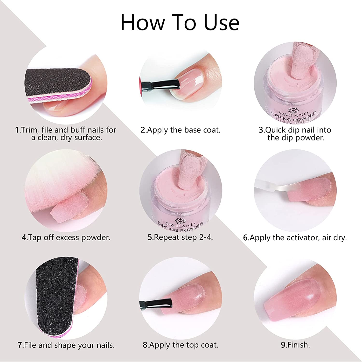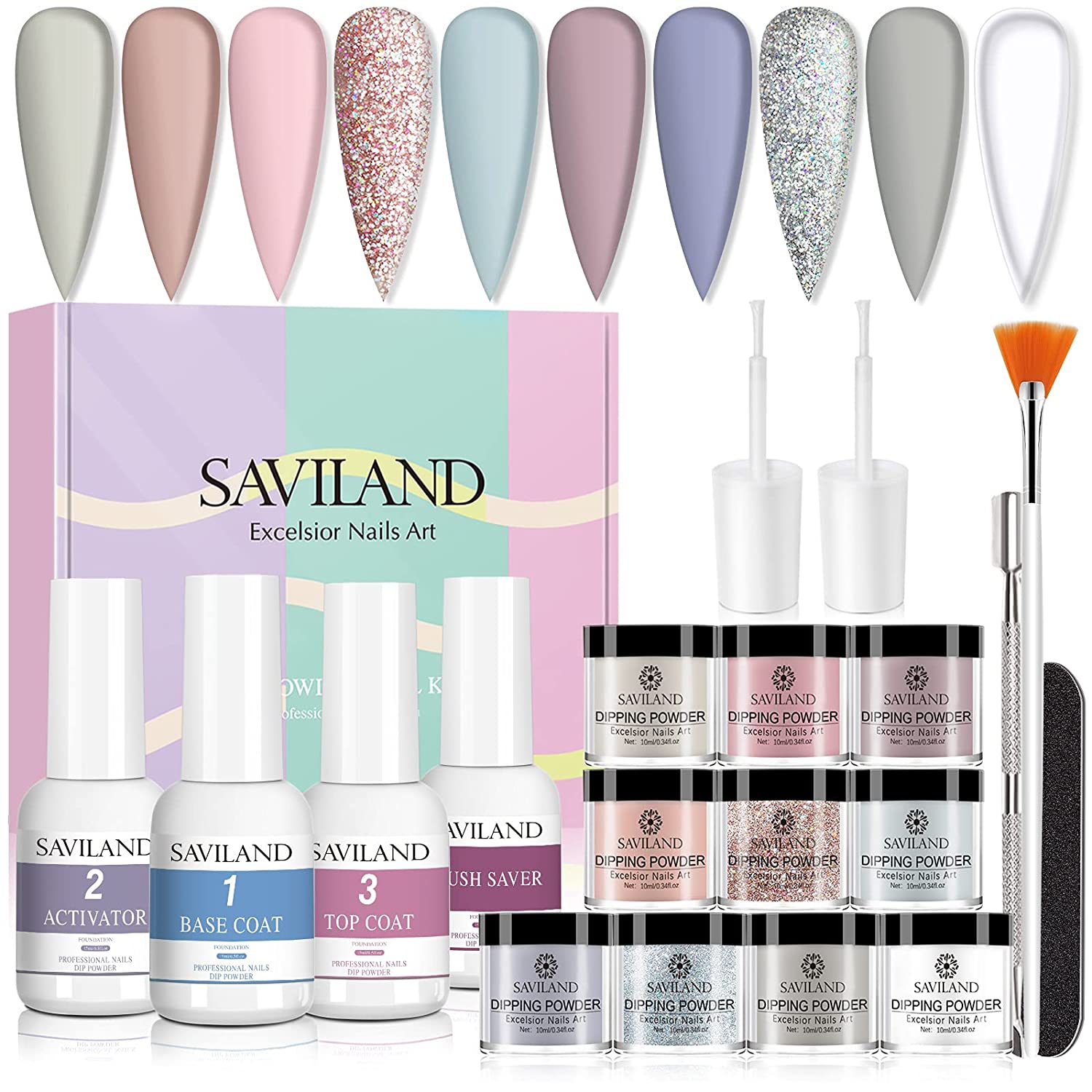 | All you want for a nail kit: dipping powder starter kit includes 08 solid color powders, 02 glitter dip powders, 01 dip powder base coat, 01 dip powder topcoat, 01 brush saver, 01cuticle pusher, 01 activator for nails, 01 nail brush, and 01 nail file. This nail dip kit is perfect for beginners or even professional manicurists to make a DIY nails. |