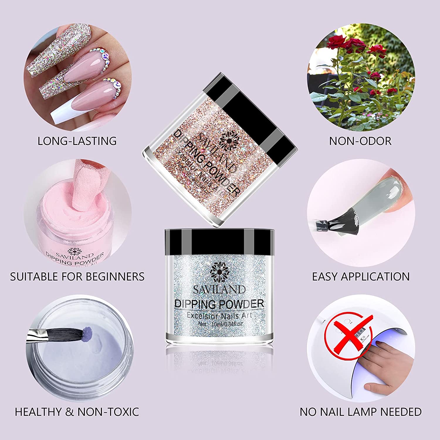 | Easy to use: the dip powder set is beginner-friendly as it is not required a UV/LED lamp to cure the nails so it can eliminate the skin damage caused by poor-quality nail lamps. |