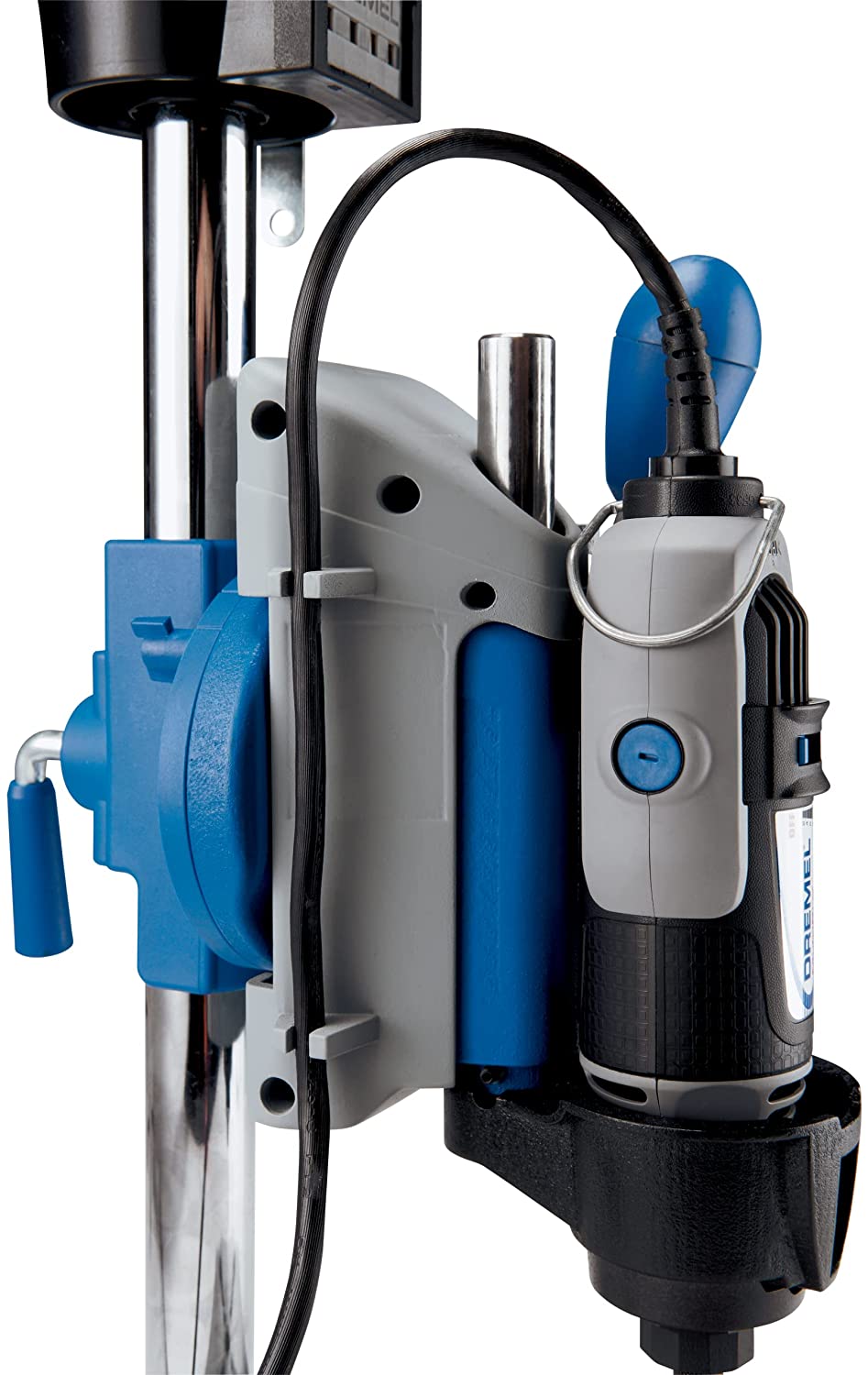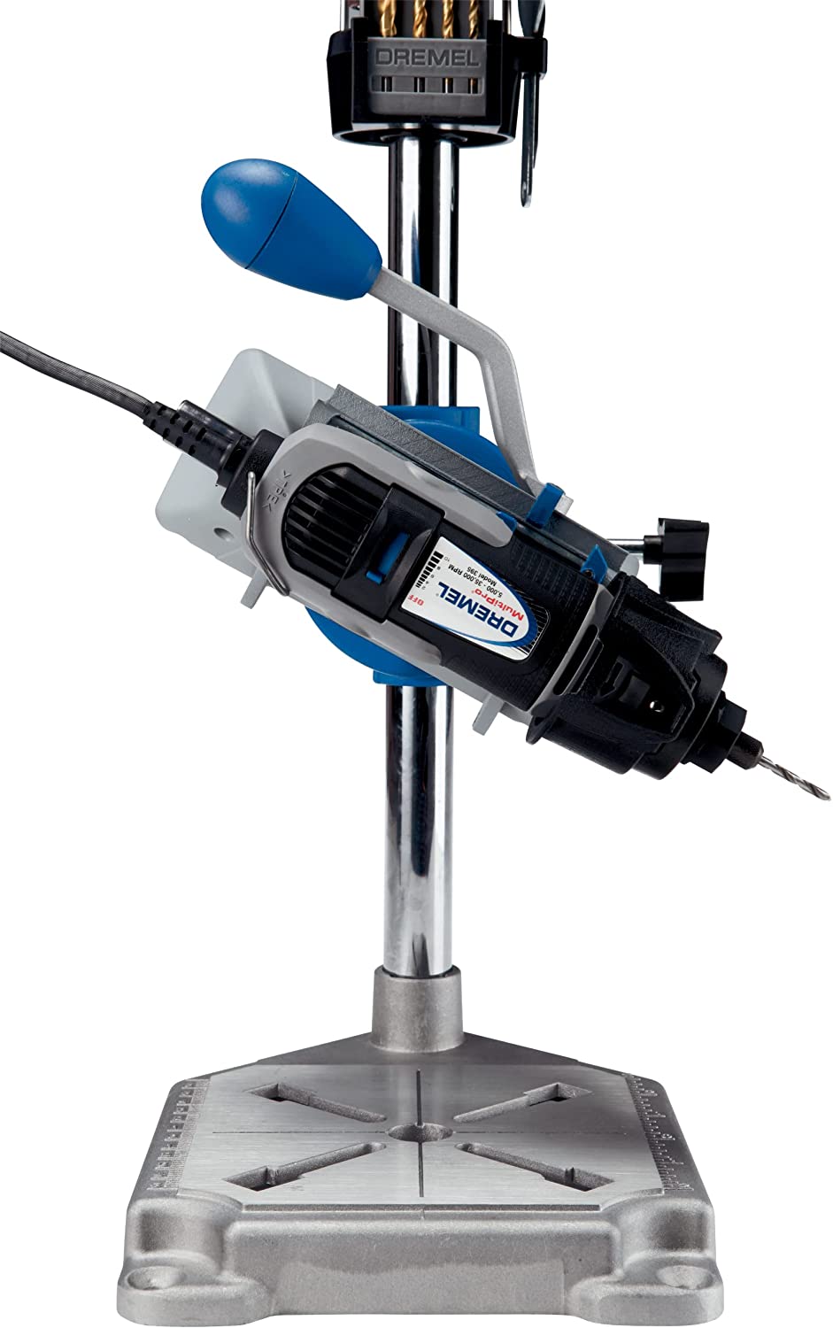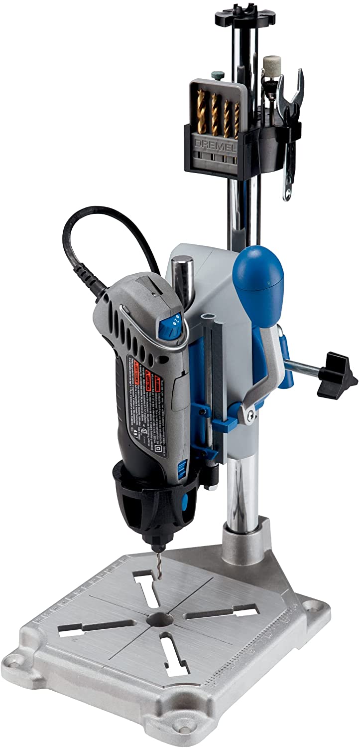 Articulating Drill Press Stand: Drills perpendicular and angled holes in 15-degree increments, up to 90 degrees horizontal Tool Holder: Holds rotary tool at 90 degrees horizontal for tasks such as polishing metal objects, sanding different shapes and grinding metal piece. Drill depth- 2 inches Flex Shaft Tool Stand: Allows Telescopic adjustment to any height between 16 and 29 inches, Crow’s nest provides on-board storage for drill bits, wrenches, and other dremel accessories Cord management clips for safe storage of power cords, inch/metric marking on base for accurate drilling of workpiece, depth markings with depth stop – for consistent depth, sturdy metal base with 4 clamping points – to securely hold the station Compatible with dremel rotary tool models 100, 200, 275, 285, 300, 395, 398, 400, 800, 3000, 4000, 4200, 8100, 8200, 8220 1 YEAR & USA-BASED CUSTOMER SERVICE: Available by chat, email, phone or visit us at our service center in Racine, WI.