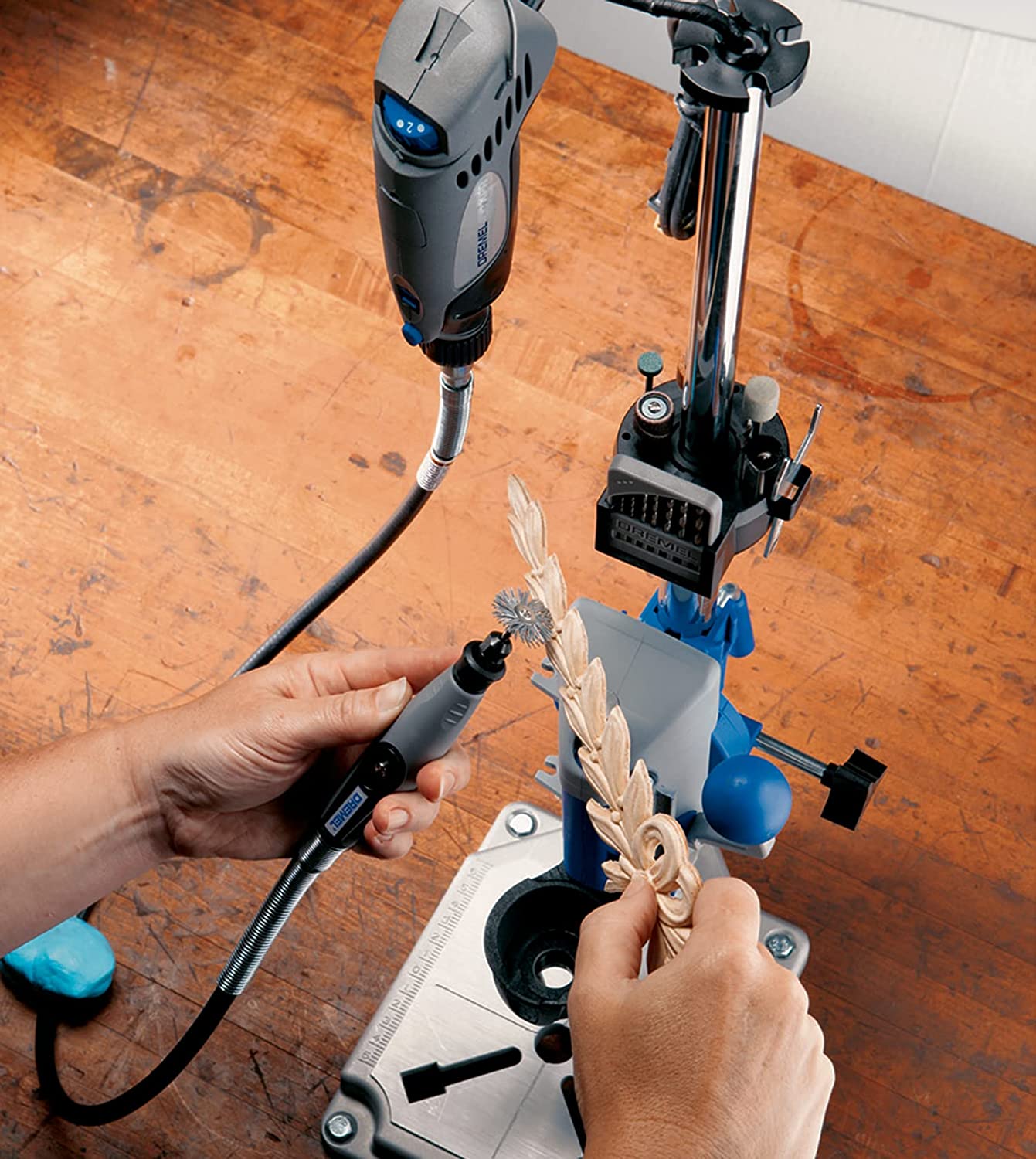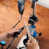 It’s a drill press, tool holder and flex shaft holder all in one. Drill accurate perpendicular and angled holes. Holds your tool in place for applications like sanding and buffing, and the telescoping flex shaft holder extends to any height between 16 and 29 inches.