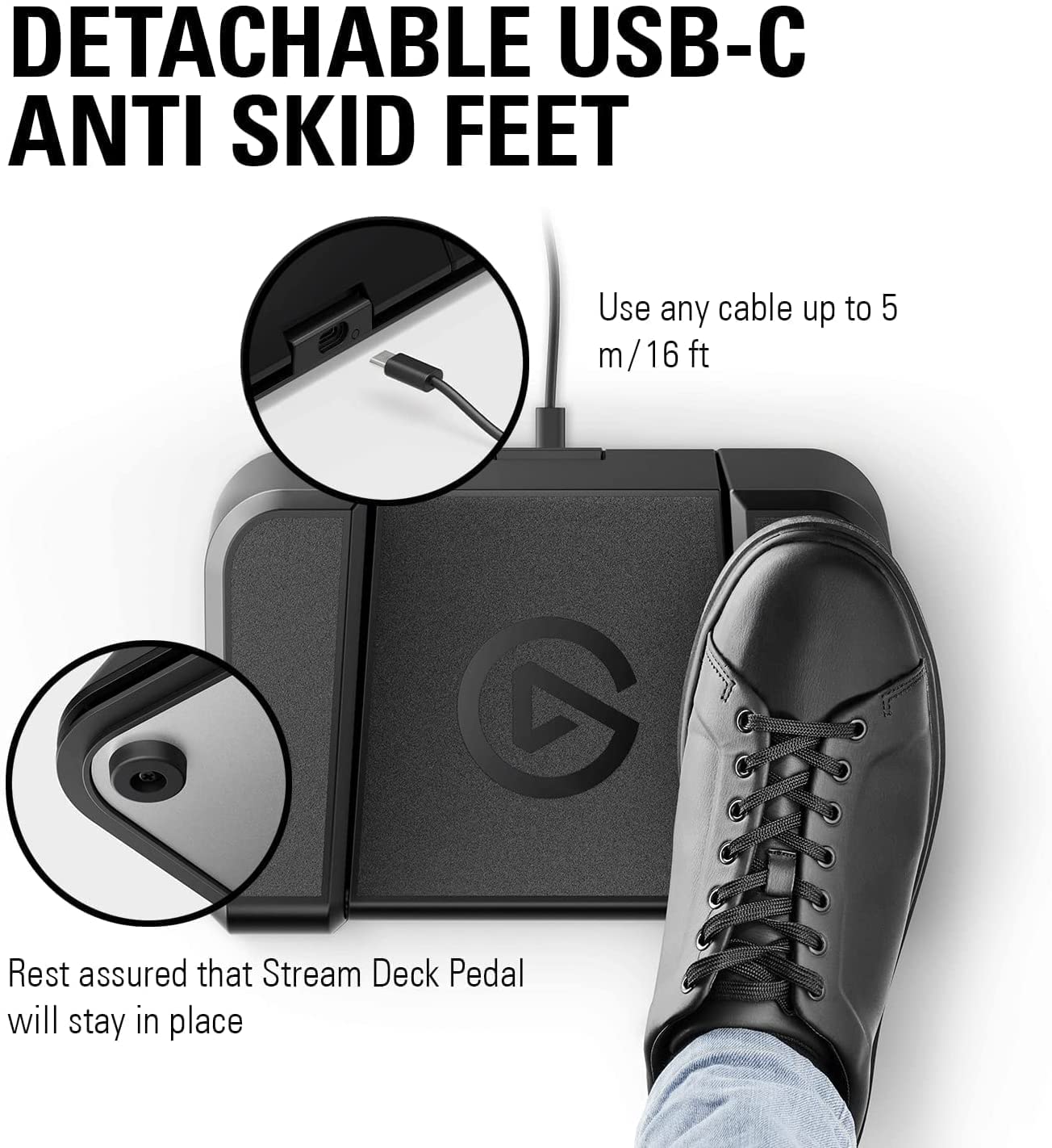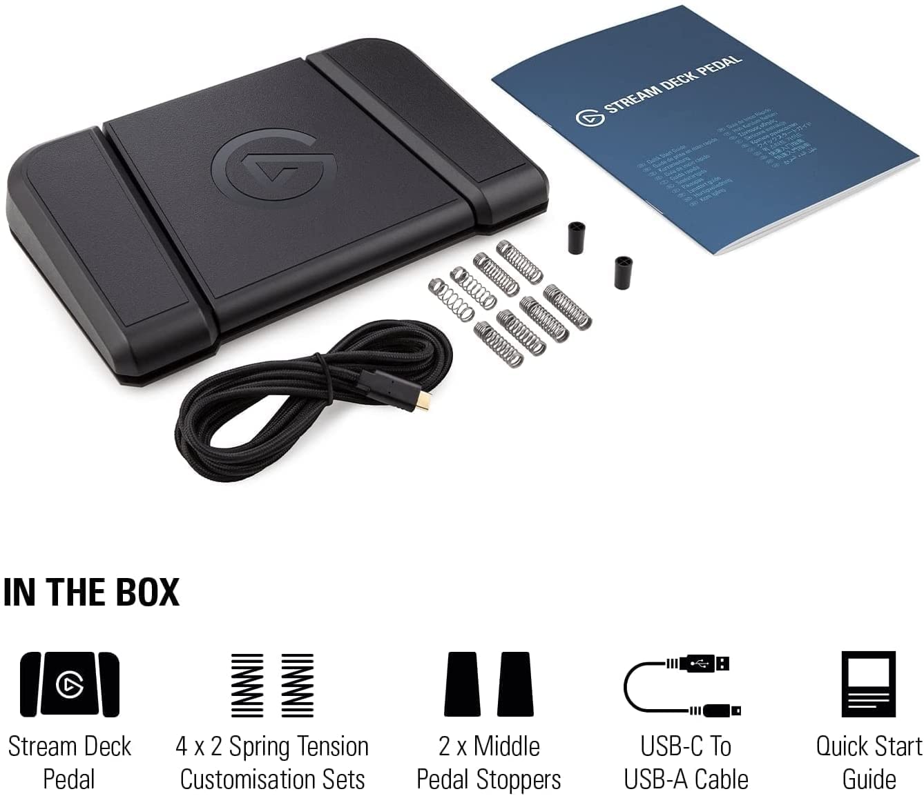 3 Customizable Pedals: Control apps, tools and platforms. One-Touch, Hands-Free: Instantly trigger single or multiple actions, go live, mute mic, toggle cameras, and much more. Interchangeable Springs, Heavy-Duty Chassis: Adjust pedal pressure, tap with confidence. Powerful Plugins: Elgato 4KCU, OBS, Twitch, YouTube, Twitter, Discord, Spotify, Philips Hue, and many more. Stream Deck Store: Download plugins, icons, thousands of royalty-free tracks, SFX, and more.