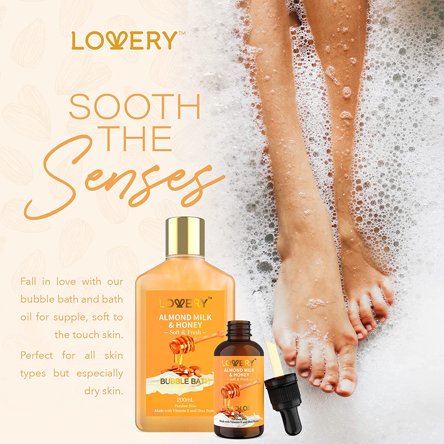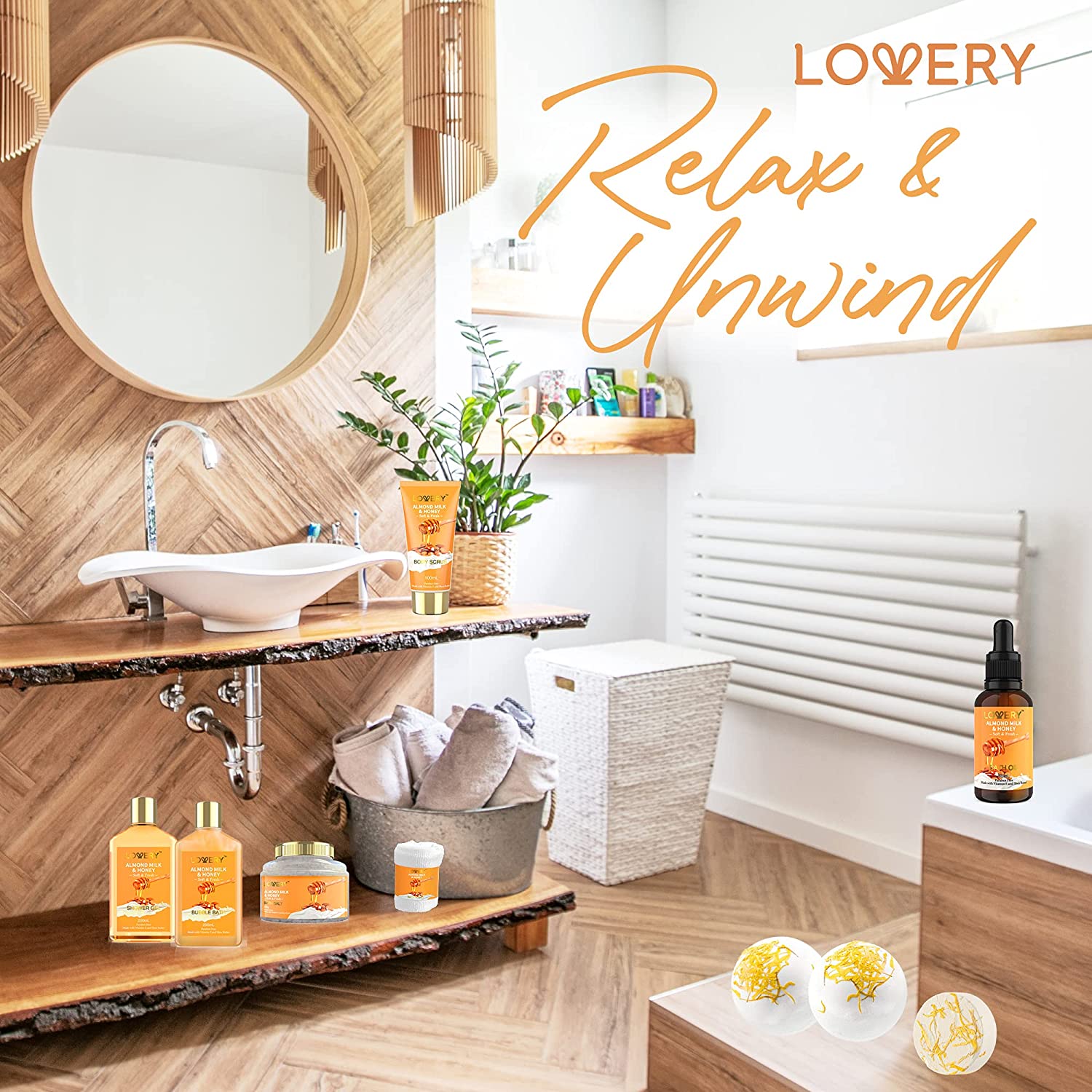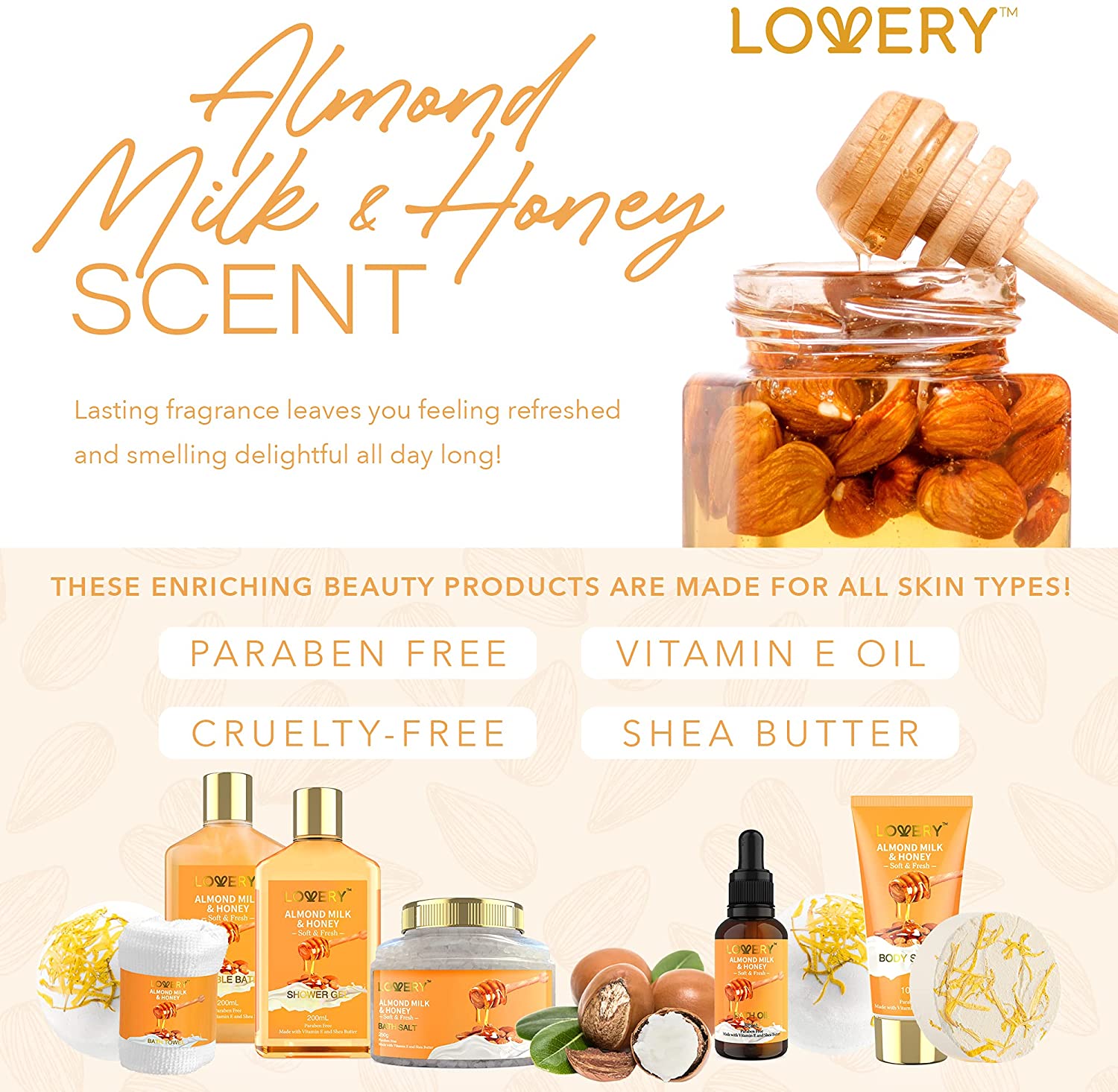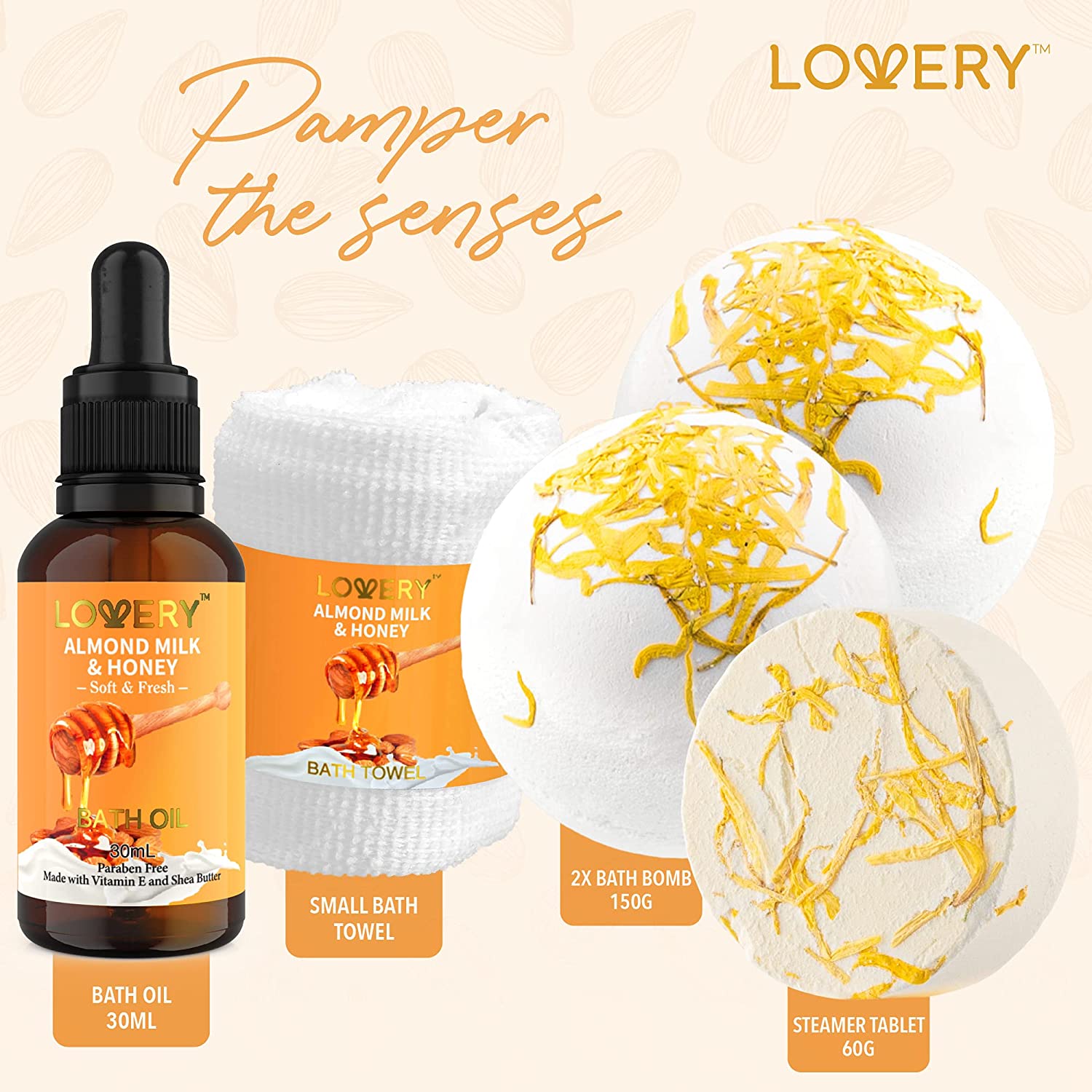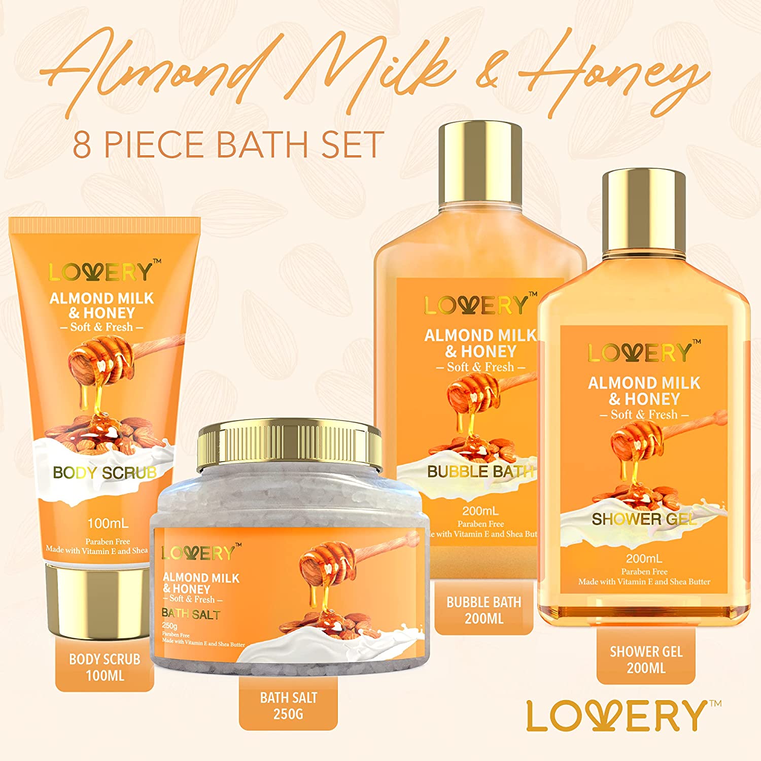 Nourish and replenish your tired, overworked skin with the 10 Pc Almond Milk & Honey Bath Gift Set from Lovery featuring a unique assortment of body pampering products. Transform the bathtub into a place of relaxation and take a moment out of your busy week for something that is just for you. Almond milk rejuvenates with anti-aging effects that keep skin soft and glowing. Honey helps skin absorb and retain moisture to keep from drying out.9 PIECE SET INCLUDES:200ml Shower Gel200ml Bubble Bath100ml Body Scrub30ml Bath Oil2 x 150g Bath Bombs250g Bath Salt60g Bath Steamer TabletBath TowelReusable Handmade BasketPRODUCT FEATURES: Long Lasting Scent Made with Shea Butter & Vitamin E Paraben Free Cruelty Free For All Skin Types – Normal, Dry, Oily, SensitiveBENEFITS OF ALMOND MILK & HONEYHoney and almond milk are natural remedies for a wide range of skin conditions due to their natural anti-inflammatory properties. Stop wrinkles from forming and retain your skin’s youthful appearance.LOVE YOUR SKIN WITH LOVERYSupercharge your skincare with the dual power of almond milk & honey. A high source of Vitamin E and other ingredients that reduce fine lines and keep skin looking smooth and soft. Almond milk hydrates skin and fights acne and blemishes. Honey moisturizes dry, sensitive skin while repairing and preventing damage.THE GIFT SHE’S BEEN WAITING FORMake her next birthday, anniversary, Valentine’s Day, or Mother’s Day extra memorable with a gift set she’ll love to use. Perfect for mom, wife, girlfriend, sister, daughter, BFF, coworker, or just that special someone – even if that special someone is YOU! Arrives delightfully packaged in a ready-to-gift basket with plush bath towel.