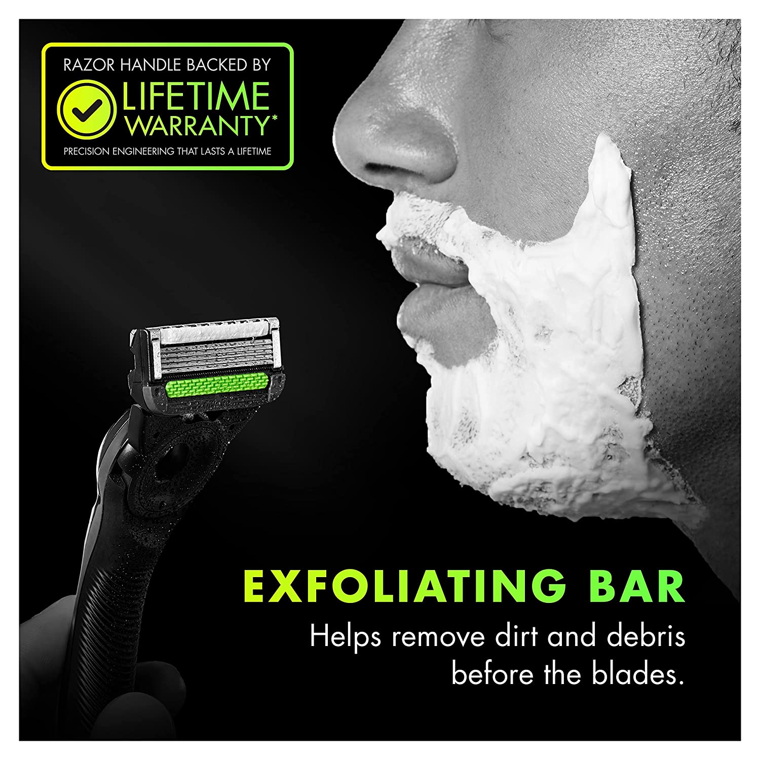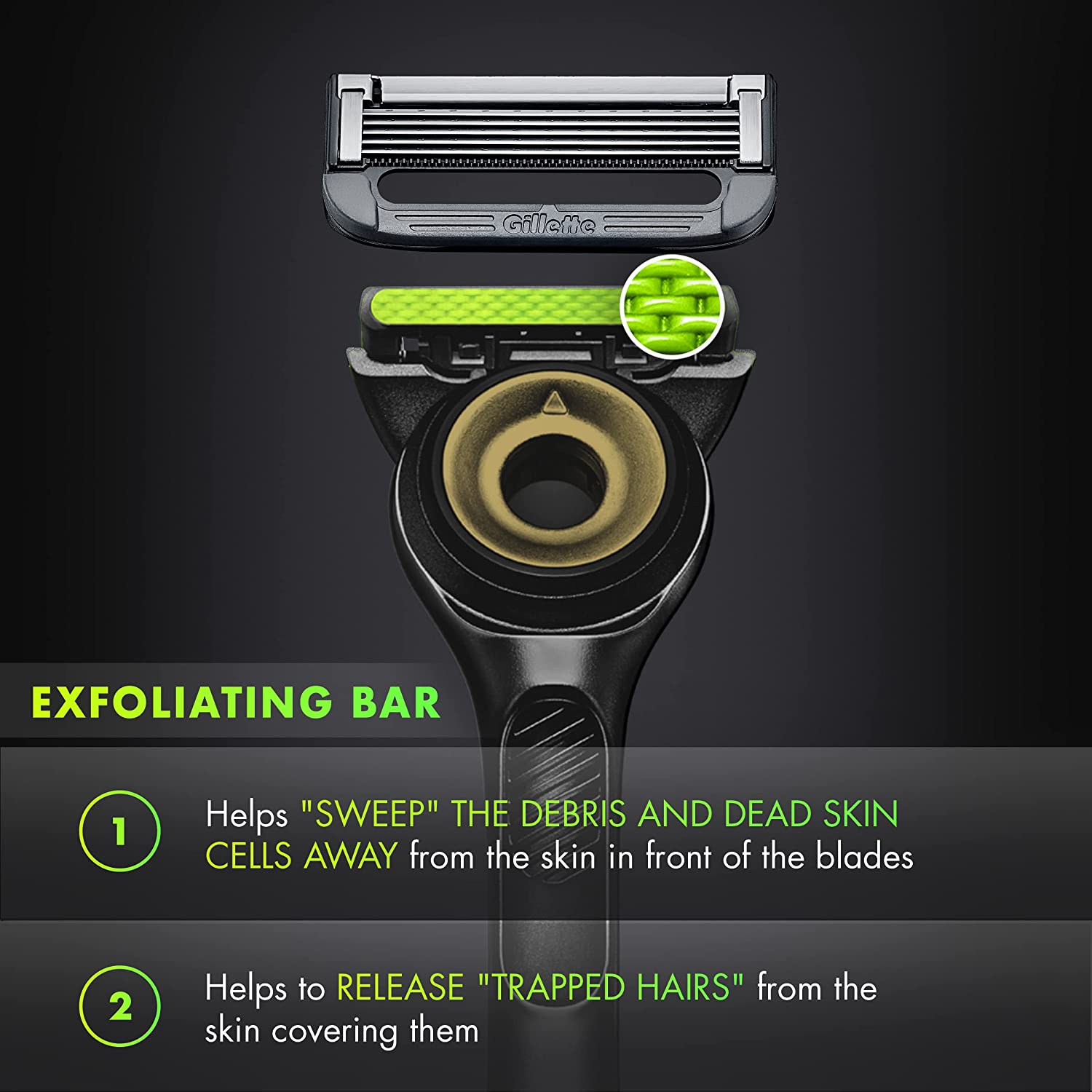 - With exfoliating bar: built-in exfoliating bar removes dirt and debris before the blades pass Incredible comfort and closeness: this razor for men features Gillette’s best razor blades* *first 4 blades