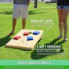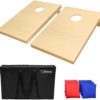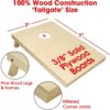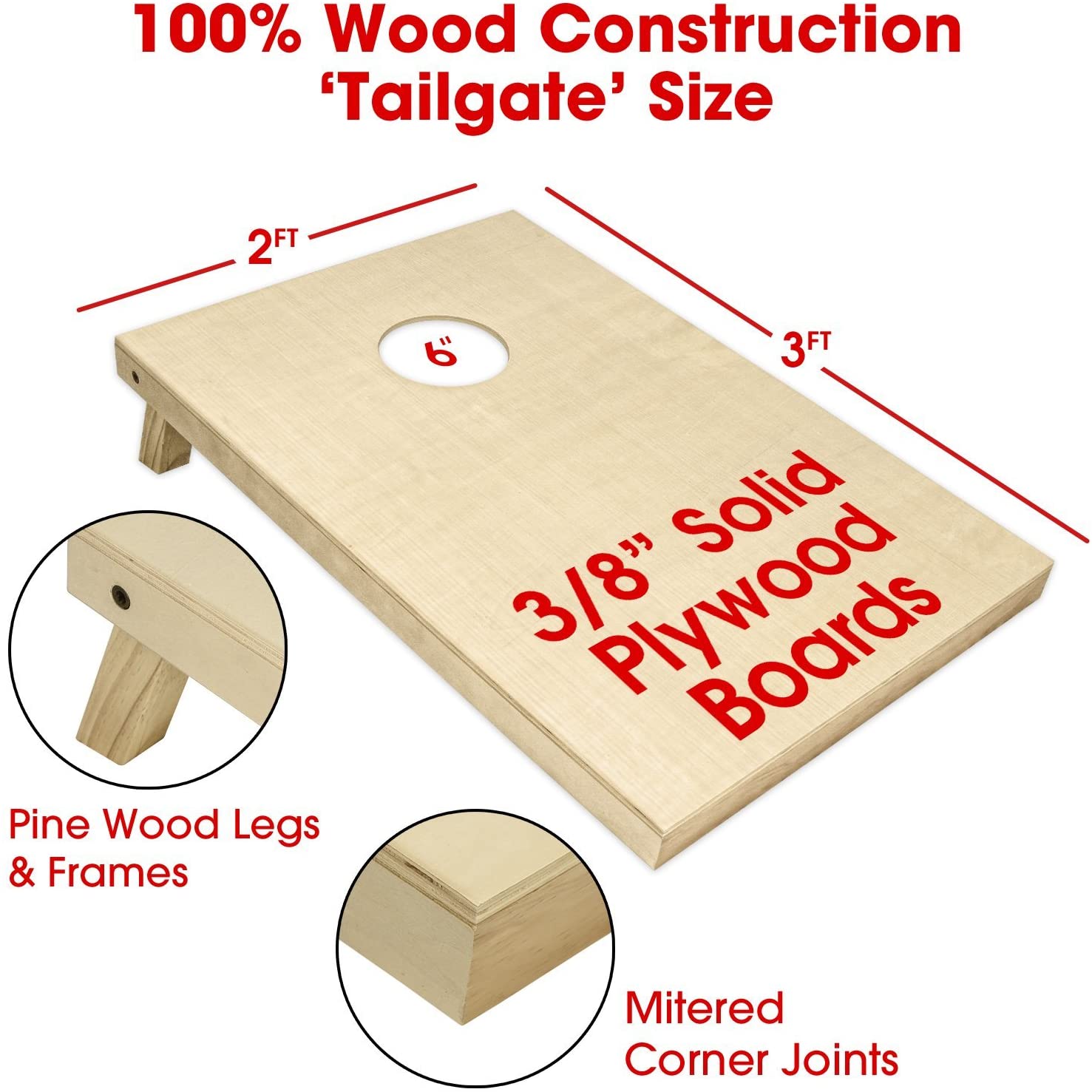 100% SOLID WOOD: Premium craftsmanship boards, varnished surface (easily painted or customized) made using pine wood frames and featuring mitered corner joints. Boards are also 100% ready to use without additional work required. TAILGATE SIZE: Full cornhole set includes 2 ‘tailgate’ size (3 feet x 2 feet) cornhole boards, 8 all-weather regulation bean bags, premium carrying case, and rules EVENT DAY FAVORITE: Hours of fun with friends and family at tournaments, tailgates, holiday weekends, cookouts, campsites, and more! PERSONALIZE YOUR SET: Customize the boards with your own decals and designs (not included) to make for the perfect cornhole set