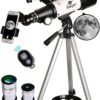 Quality Optics: 400mm(f/5.7) focal length and 70mm aperture, fully coated optics glass lens with high transmission coatings creates stunning images and protect your eyes. Perfect telescope for astronomers to explore stars and moon. Magnification: Come with two replaceable eyepieces and one 3x Barlow lens.3x Barlow lens trebles the magnifying power of each eyepiece. 5×24 finder scope with mounting bracket and cross-hair lines inside make locating objects easily. Wireless Remote: Free includes one smart phone adapter and one Wireless camera remote to explore the nature of the world easily through the screen and take amazing celestial images. Adjustable Tripod: This telescope allows for many different viewing positions with a adjustable aluminum alloy tripod and a carry bag, the telescope and tripod can fit inside the bag for easy traveling and storage. Satisfaction: TWO-YEAR warranty. And technical support from our team of experts in 24 hours.