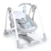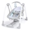 About this item Bring baby’s favorite seat on-the-go with this small baby swing 2-in-1 design converts from swing to vibrating seat Features 5 swing settings, automatic swinging and vibrating Quiet motor plus 12 soothing melodies and 4 nature sounds Foldable design lays flat for storage or travel