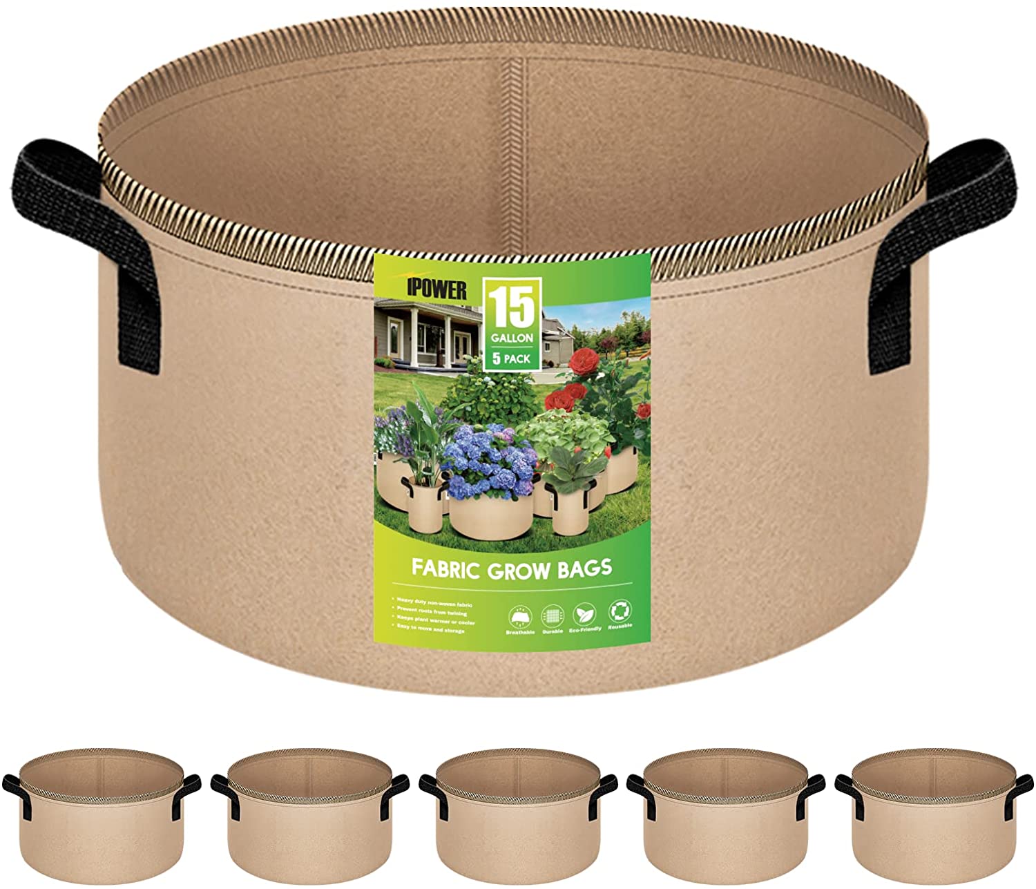 iPower 5-Pack 15 Gallon Grow Bags Nonwoven Fabric Pots Aeration Container with Strap Handles for Garden and Planting, Tan