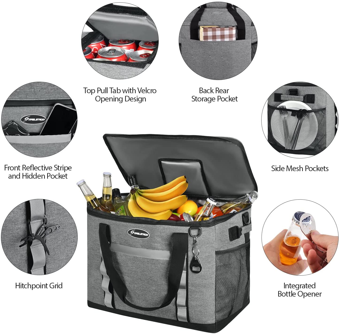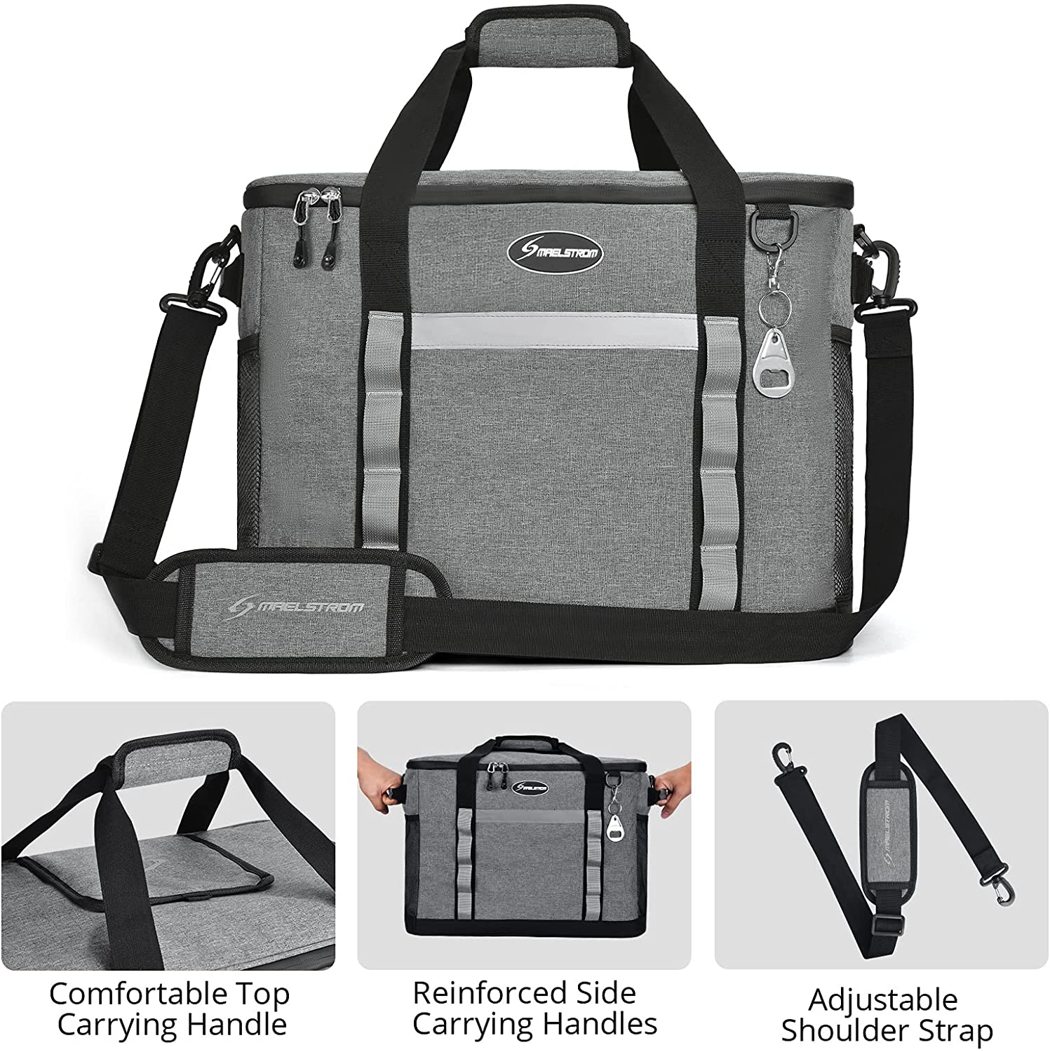 EXTRA LARGE CAPACITY – Extra-large size yet weighs only 1.65 lbs. The Maelstrom Icy Hollow Soft sided cooler will hold up to 75 cans of your favorite drinks plus 2-4 ice packs; or with 60 cans you can add 15 lbs. of ice for long lasting coldness. Whether it’s camping, hiking, picnicking, or a BBQ party, the cooler bag easily packs a lot of food, fruits, beer, meat, or even seafood together. It’s large enough to carry all picnic essentials for the whole family! EXTRA LARGE CAPACITY – Extra-large size yet weighs only 1.65 lbs. The Maelstrom Icy Hollow Soft sided cooler will hold up to 75 cans of your favorite drinks plus 2-4 ice packs; or with 60 cans you can add 15 lbs. of ice for long lasting coldness. Whether it’s camping, hiking, picnicking, or a BBQ party, the cooler bag easily packs a lot of food, fruits, beer, meat, or even seafood together. It’s large enough to carry all picnic essentials for the whole family! DURABLE – Maelstrom Ice Hollow Soft Sided Cooler Bags have double-stitched carry options. All pick-up points, the shoulder straps and carry handles are reinforced. This cooler bag can handle more weight than you’d prefer to carry. Capacity: 18x12x13.8 inches, 13 Gallons of ice and drinks. UNIQUE DESIGN – Top pull tab with Velcro opening design, easy to access your food without having to open the zipper around the whole top cover, keeping contents cool/warm longer. Ergonomic design with two different ways to carry – adjustable straps and a carrying handle. An integrated bottle opener gives you a quick access to pop open a bottle of beer. VERSATILE – Suitable for all outdoor activities as an all-around soft sided cooler for camping or road trips. It’s the perfect size for food delivery services and a great solution to transport groceries from the store or farmer’s market to your kitchen at home.