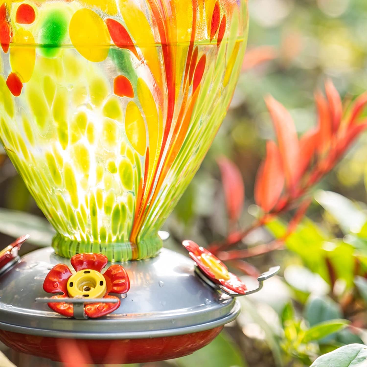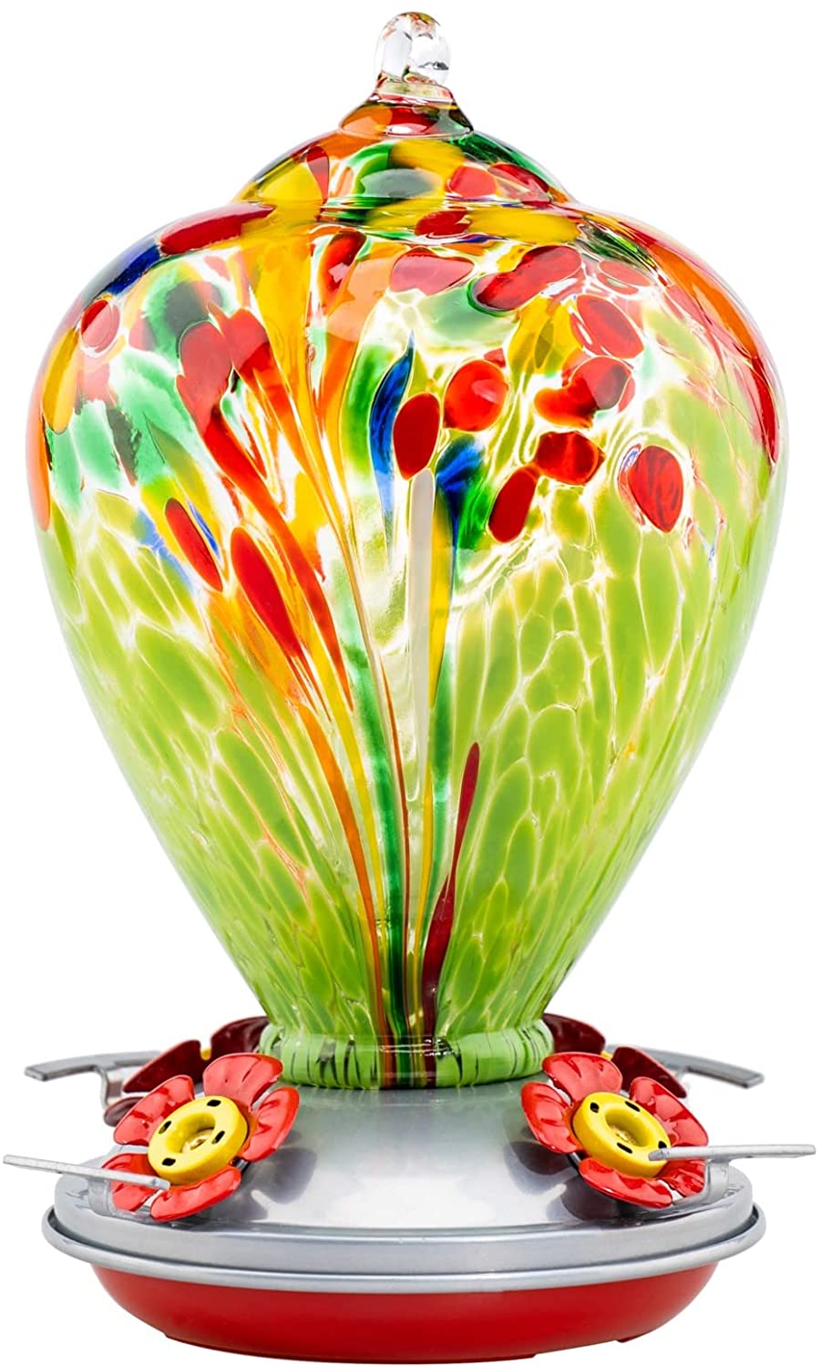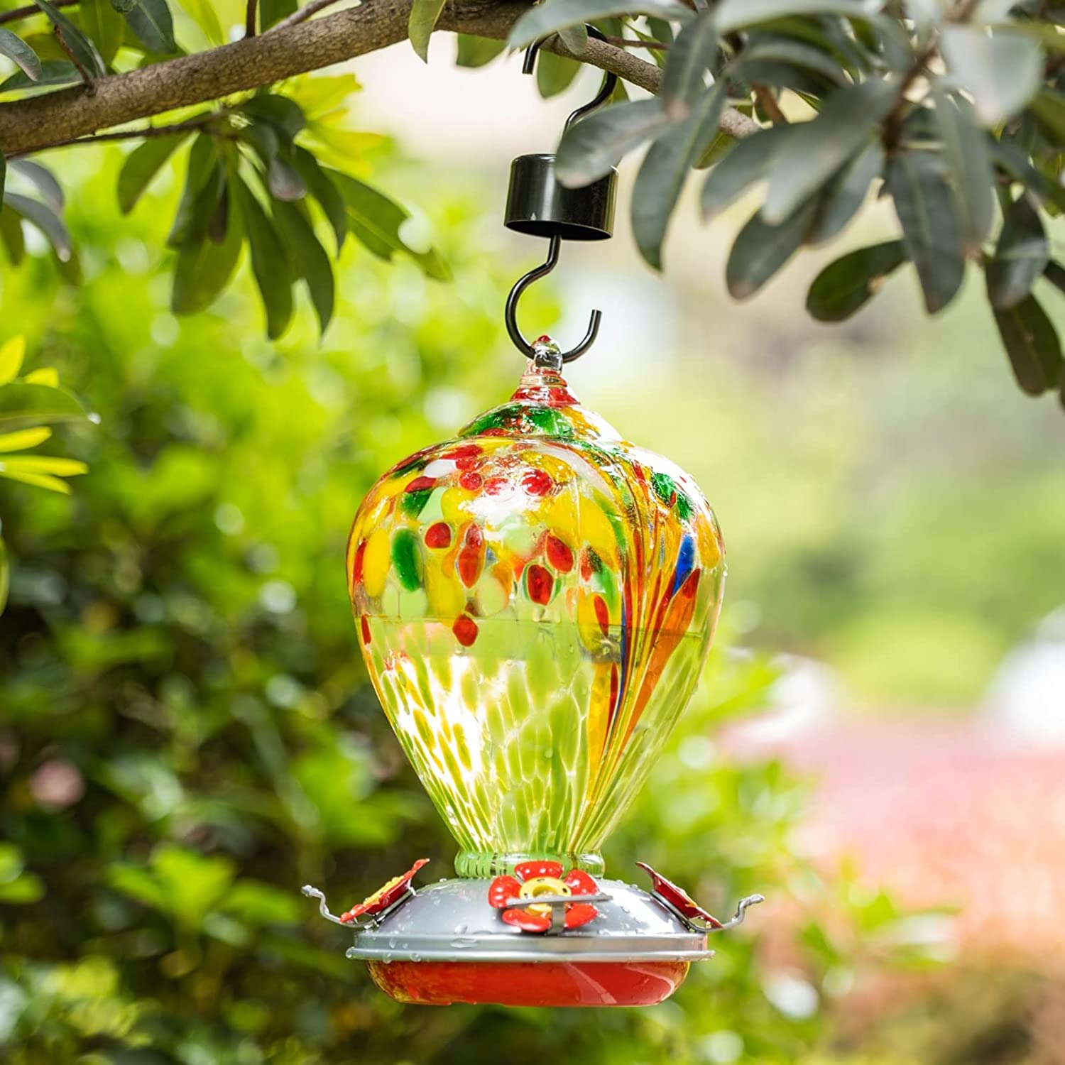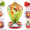 Muse Garden Hummingbird Feeder for Outdoors, Hand Blown Glass, 34 Ounces, Containing Ant Moat, Green Fireworks