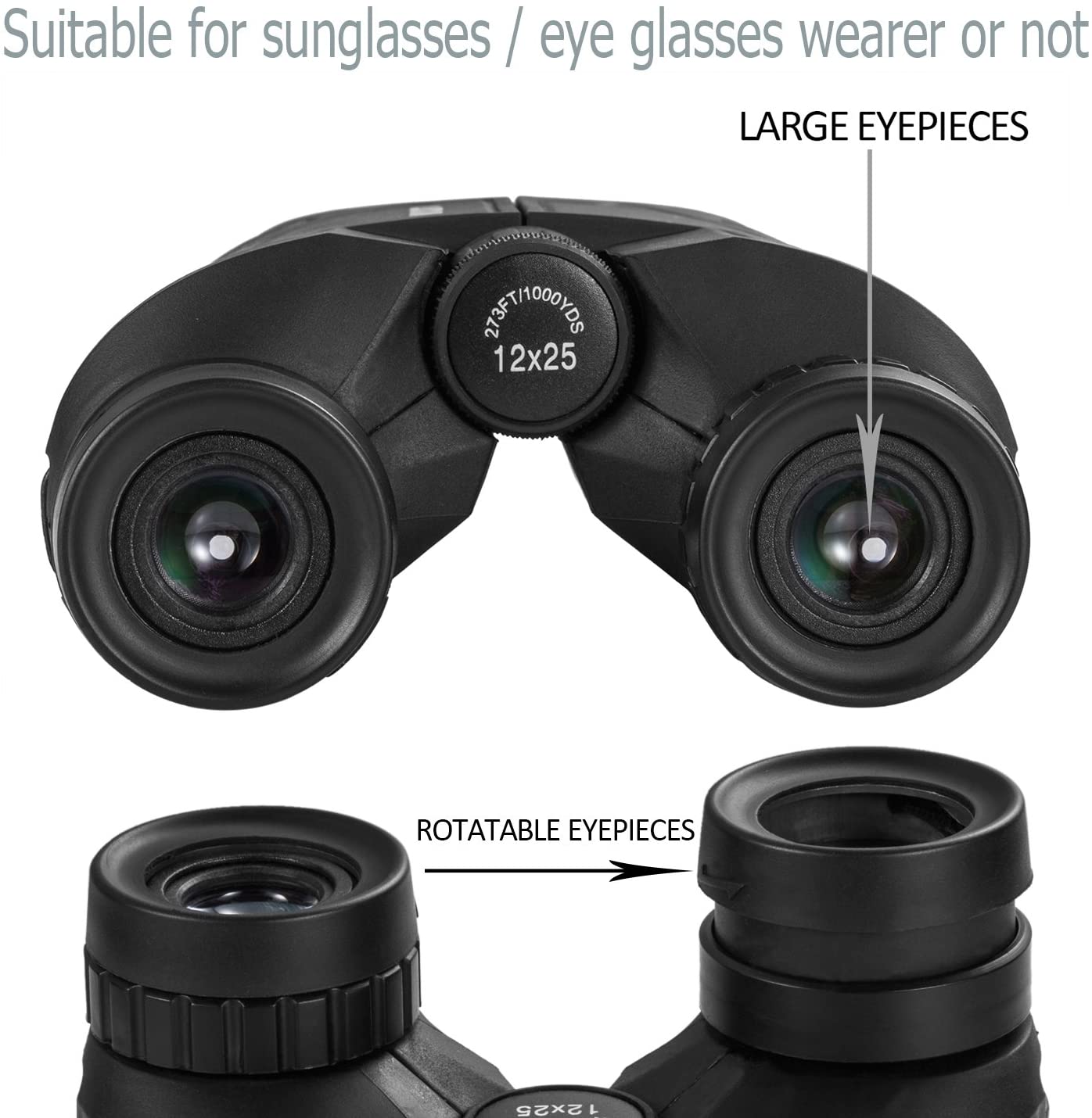 【HIGH-POWERED LARGE EYEPIECE BINOCULARS】 This binoculars has 12x magnification, 25mm objective lens and wide field of view, 273ft/1000yds, letting you look farther and see wider. Coating with FMC Broadband coating and premium BAK4 prism, it ensure imaging verisimilar. 【ADJUSTABLE EYE CUPS FIT EYEGLASS WEARERS OR NOT】The binocs can be pull down the rubber eyepieces and more fit the glasses wearer, getting close to lens and see easily. The long eye relief combined with large eyepiece give you a comfortable viewing while wearing sunglasses or eye glasses. For those who do not wear glasses, will gain more focused slight and feel more easeful through rising eye cups. The compact binoculars has 15mm large eyepieces, can see more clear image than other binoculars. 【FMC BROADBAND COATING TECHNOLOGY】The lightweight cruise binoculars is cover with BAK4 prism texture. The objective lens use optical FMC multilayer broadband green film, and the eyepiece-optical is made of blue FMC coating. All design ensure to provide a good image and make you have a amazing experience. 【PORTABLE, COMPACT AND SMALL BINOCULARS DESIGN】 One hand can be mastered when you use the birding binoculars for opera,bird watching camping, traveling,wildlife watching,football games,cruise or other outside activity, the low light night vision goggles(Not for completely dark night) is more convenient for using and carrying. 【DURABLE AND LIFE WATERPROOF, COMFORTABLE TOUCH】 The binoculars are made of ABS plastic and it also come with a cruise binocular strap, you can use this item in different situations. And rubber armor is made for secure grip.The pocket size binoculars is not only suitable for men and women,but also suitable for kids.It is wonderful to be a gift on Father’s Day and Children’s Day.