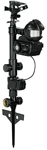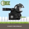 • Heavy-duty construction with metal dual step spike and brass hose connection | 35-Feet adjustable impact sprinkler and 30 minute timed watering setting | 120-Degree sensor
