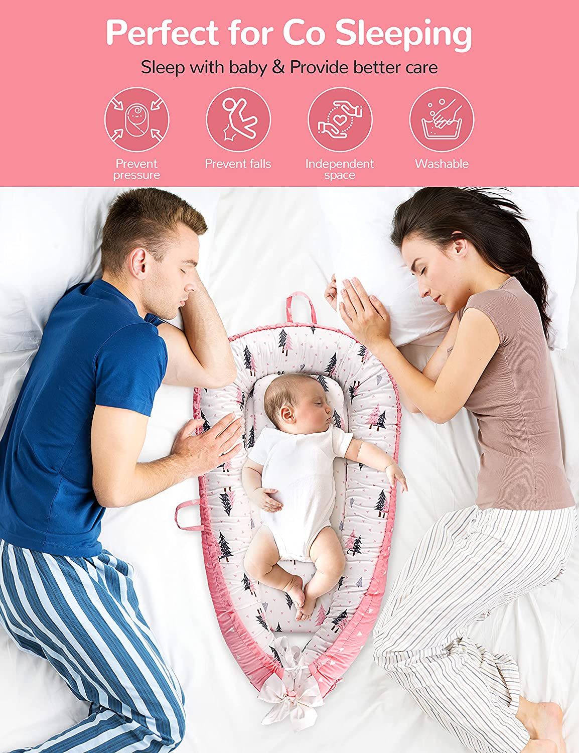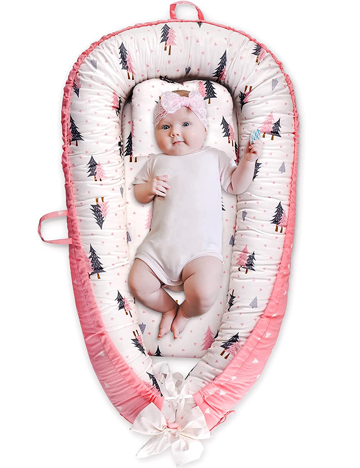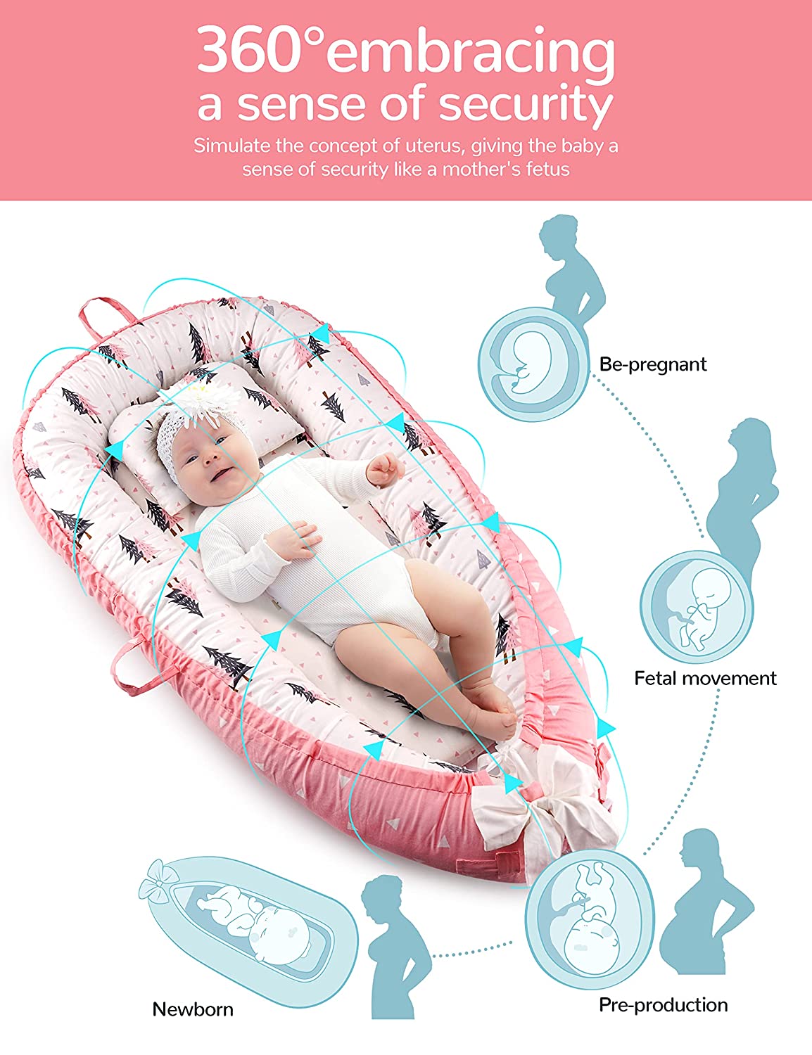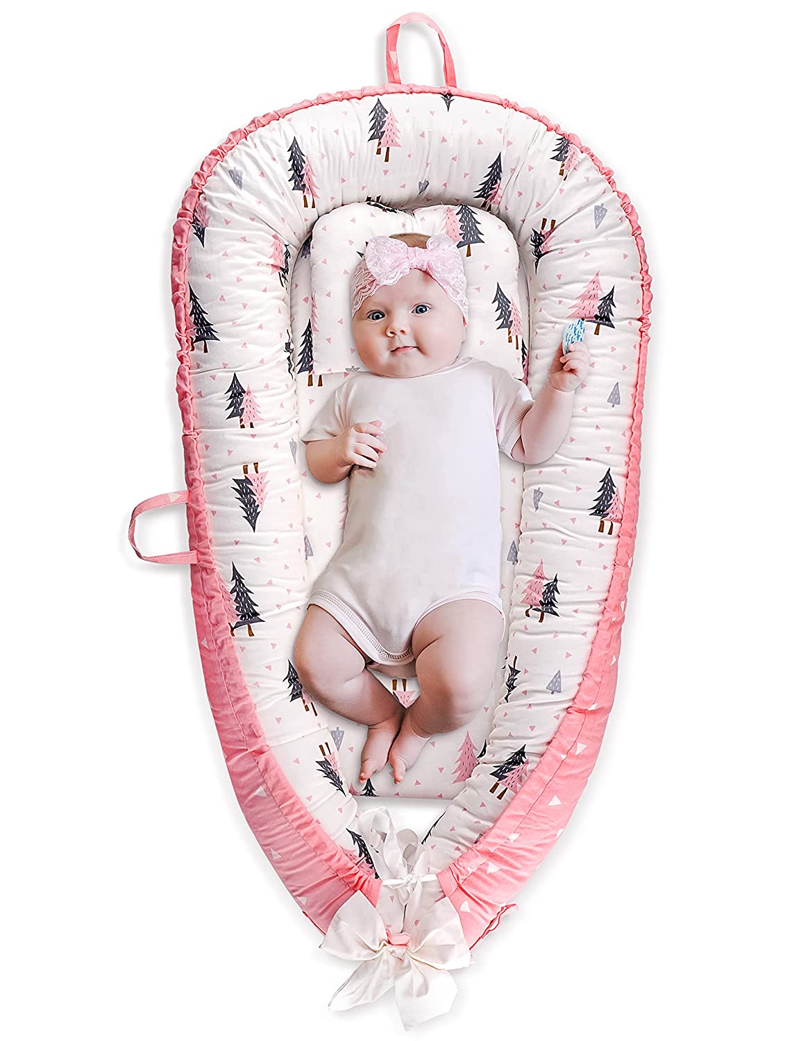 OTTOLIVES Baby Nest Baby Lounger Co-Sleeping for Newborn 360° Protection Premium Natural Cotton Newborn Lounger Bassinet Mattress Washable Adjustable Portable Baby Bed with Pillow (Sapling Pink)