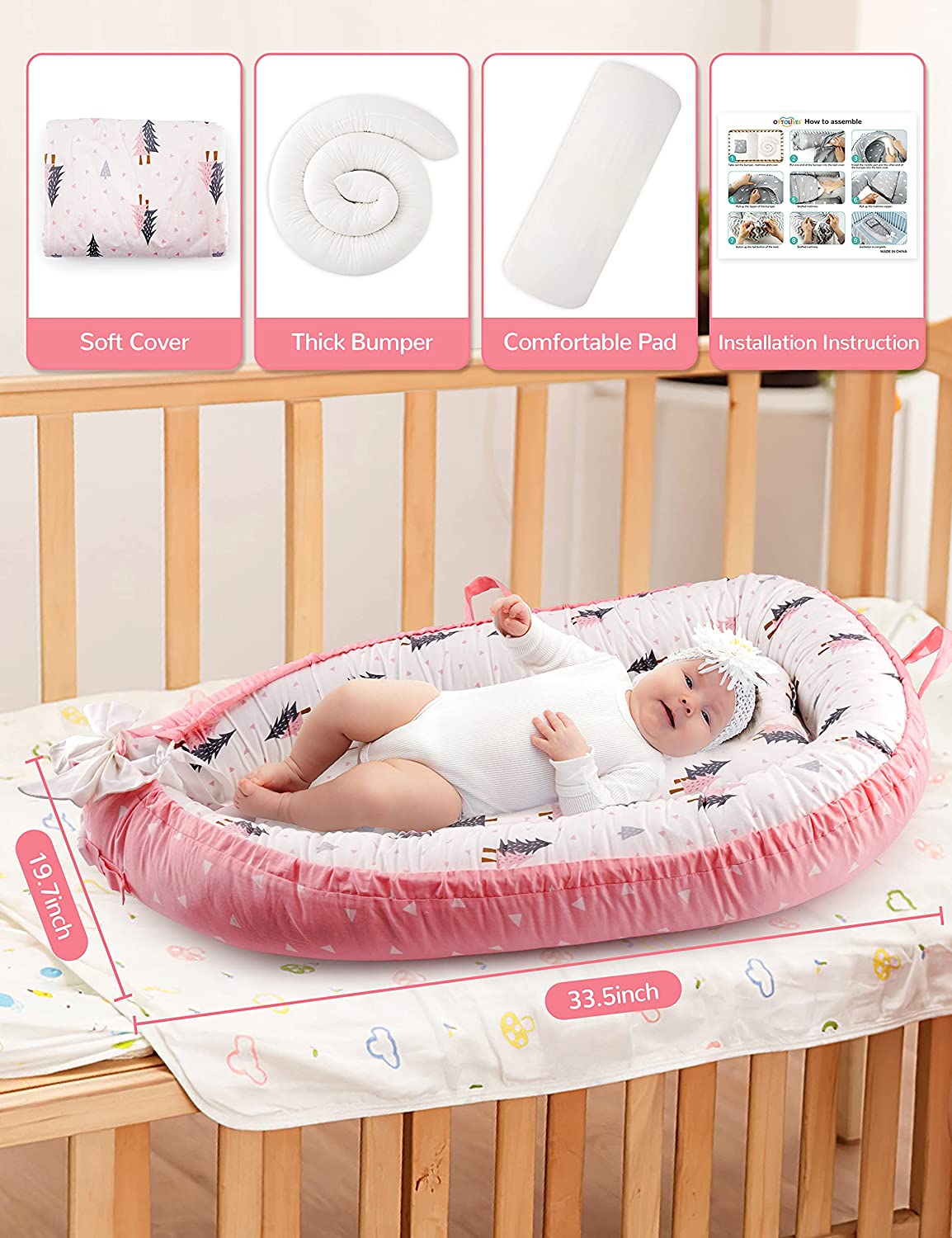 About this item 80% Cotton. 20% Foam 👼🏻[Super soft & Breathable] OTTOLIVES baby nest is made of 100% premium natural cotton soft & breathable. The baby lounger imitates a warm uterus, creating a familiar sleeping environment for newborns and providing them with a soft, safe and comfortable feeling. Let babies and parents co-sleeping better every night. 🛡️[Bionic design & Perfect sleep] newborn lounger adopts a soft bed cover and a thicker mattress, which can effectively support and protect the newborn’s spine and help natural growth. The safety of the thick bumper can restore the environment of the mother’s womb and soothe the baby to fall asleep quickly. The sturdy armrests of the baby nest can prevent the baby from falling or getting injured during the game, and it can also create conditions for co-sleeping. Sleep more comfortably. 🌟 [Adjustable & Washable] The size of the baby portable bed can be adjusted as the baby grows up, and the end of the bumper can be fully opened, suitable (0-12M+). The baby lounger uses a hidden zipper, which is simple and beautiful. The bumper adopts an upgraded version of the zipper, which is easy to remove and install the baby nest cover, and supports hand washing and machine washing. 🤱 [Portable & Versatile] The size of the baby nest is approximately 33.5 x 19.6 inches, and the weight is only 3.2pounds (1.46 kg). With two handles for easy transportation, it can be placed on a sofa, a crib or the floor of a living room, while meeting the needs of travel. This bed has the effect of soothing the child, and it is convenient for the mother to take care of short-term housework (diaper changing, milk powder, etc.) at the same time . It is an ideal newborn baby shower gift. 💕[Excellent quality & Service] Your satisfaction is our first priority. If you have any questions or questions, please contact us and we will reply in time. We are happy here to help you.