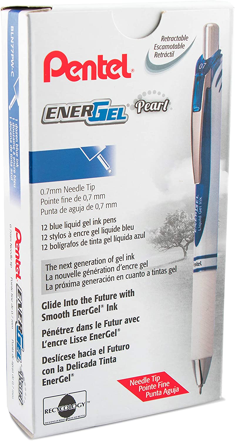 Pentel EnerGel RTX Pearl Retractable Liquid Gel Pen, (0.7mm) Medium Line, Needle Tip, Blue Ink, 12 pack (BLN77PW-C)
