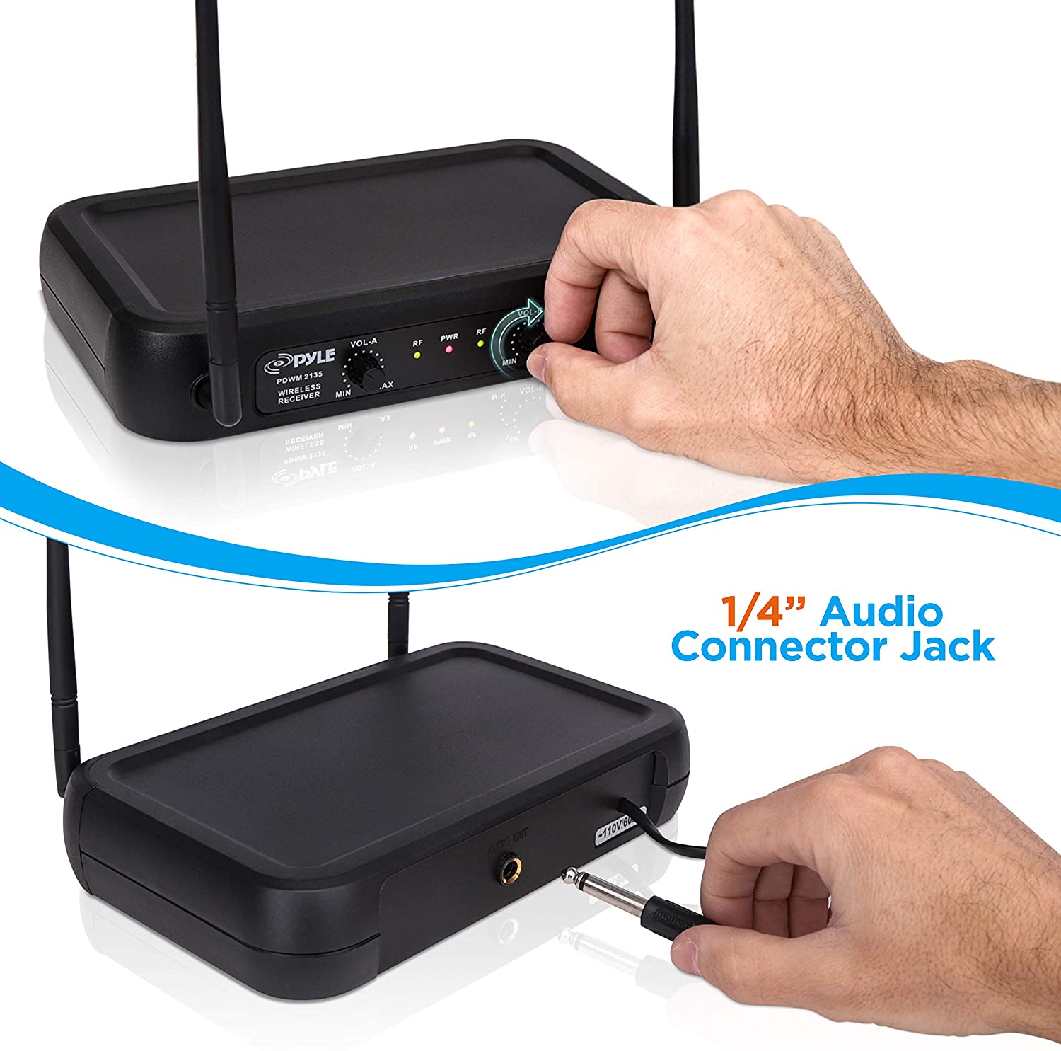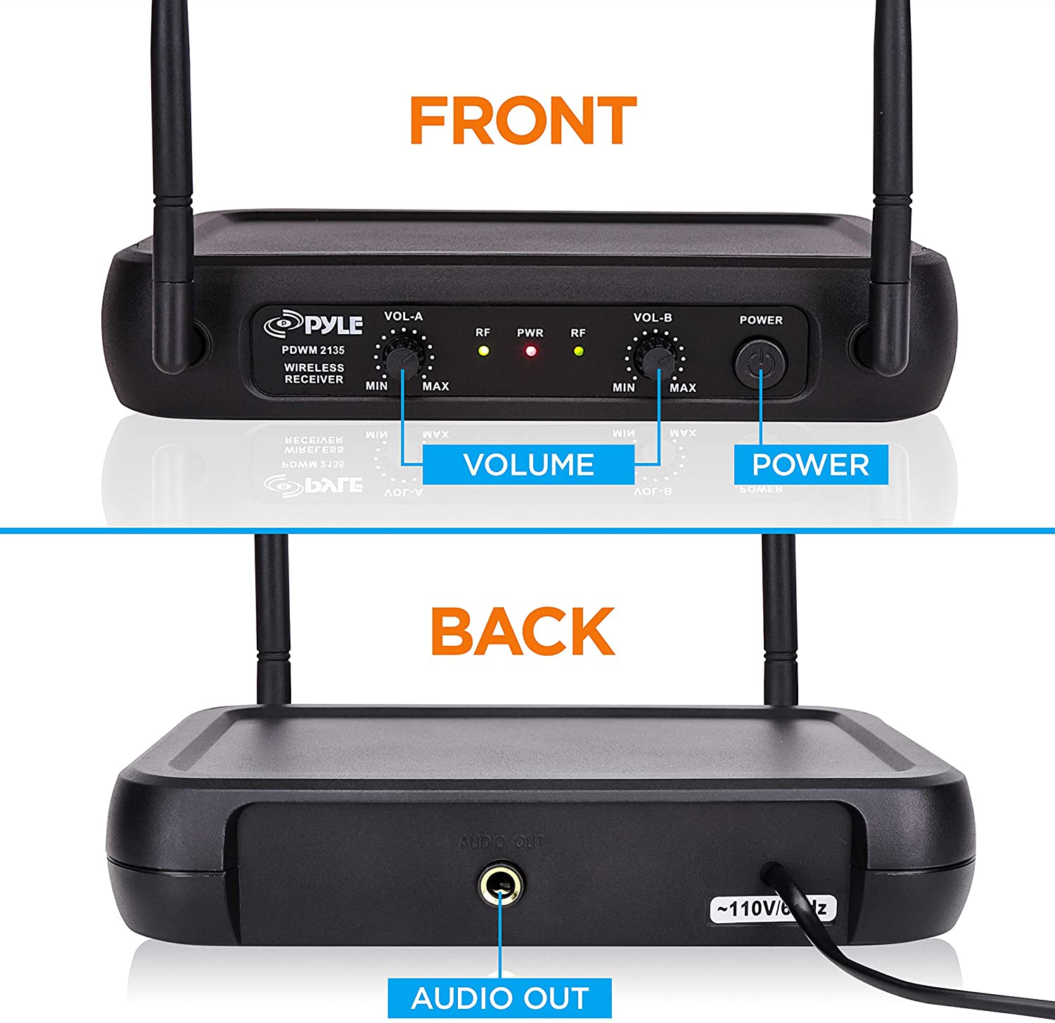 DUAL CHANNEL: This black wireless microphone system by Pyle Pro has dual frequency channel and broad audio response range with low distortion so you can enjoy cordless singing to karaoke music and mobility for energetic on stage performance STABLE SIGNAL & CLEAR SOUND: This professional portable wireless microphone set has a channel frequency range of 174~216MHz and high signal over noise ratio performance for capturing high quality audio. Ideal for professional engagement, conference INDEPENDENT MIC VOLUME CONTROL: Each dynamic or lav mic features its own volume control so you can balance the vocals as desired for a karaoke experience that both kids and adults will enjoy. Perfect for PA, karaoke, Dj party CONVENIENT POWER SWITCH: Both the receiver and the mic has a power ON / OFF switch and the receiver has LED status signal indicator light and dual independent antenna. Plug your unit into your mixer, amplifier, or speaker with a 1/4″ mono cable WHAT’S IN THE BOX: The package includes a receiver and 2 wireless handheld dynamic transmitter mic. The device can be used outdoor and indoor like a school classroom, church or at home for personal use