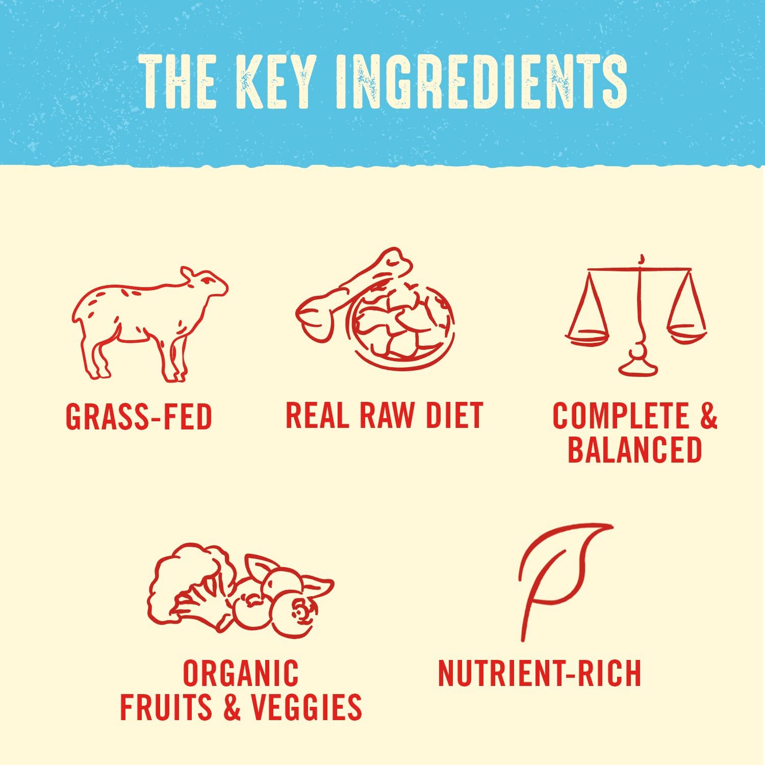 - Only the good stuff! Dogs naturally crave meat, much like they ate in the wild. That’s why every batch of Dandy Lamb Dinner Patties starts with 95 percent lamb (always grass-fed), organs and bone plus 100 percent organic certified fruits and vegetables to guarantee your pet is eating as nature intended. All ingredients are responsibly sourced.