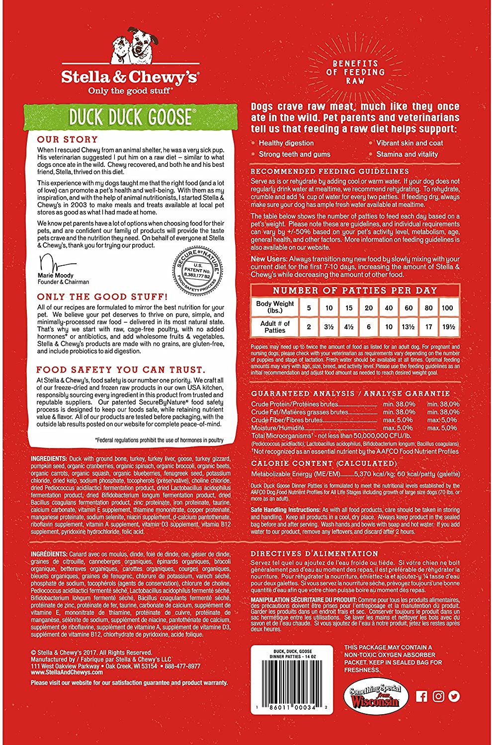 Stella & Chewy’s Freeze-Dried Raw Duck Duck Goose Dinner Patties Dog Food, 14 oz. Bag