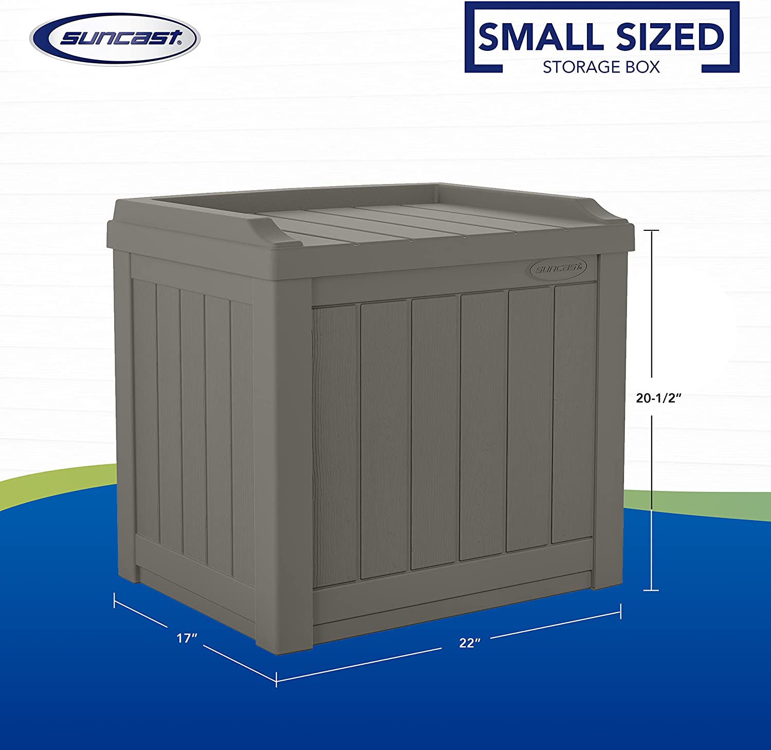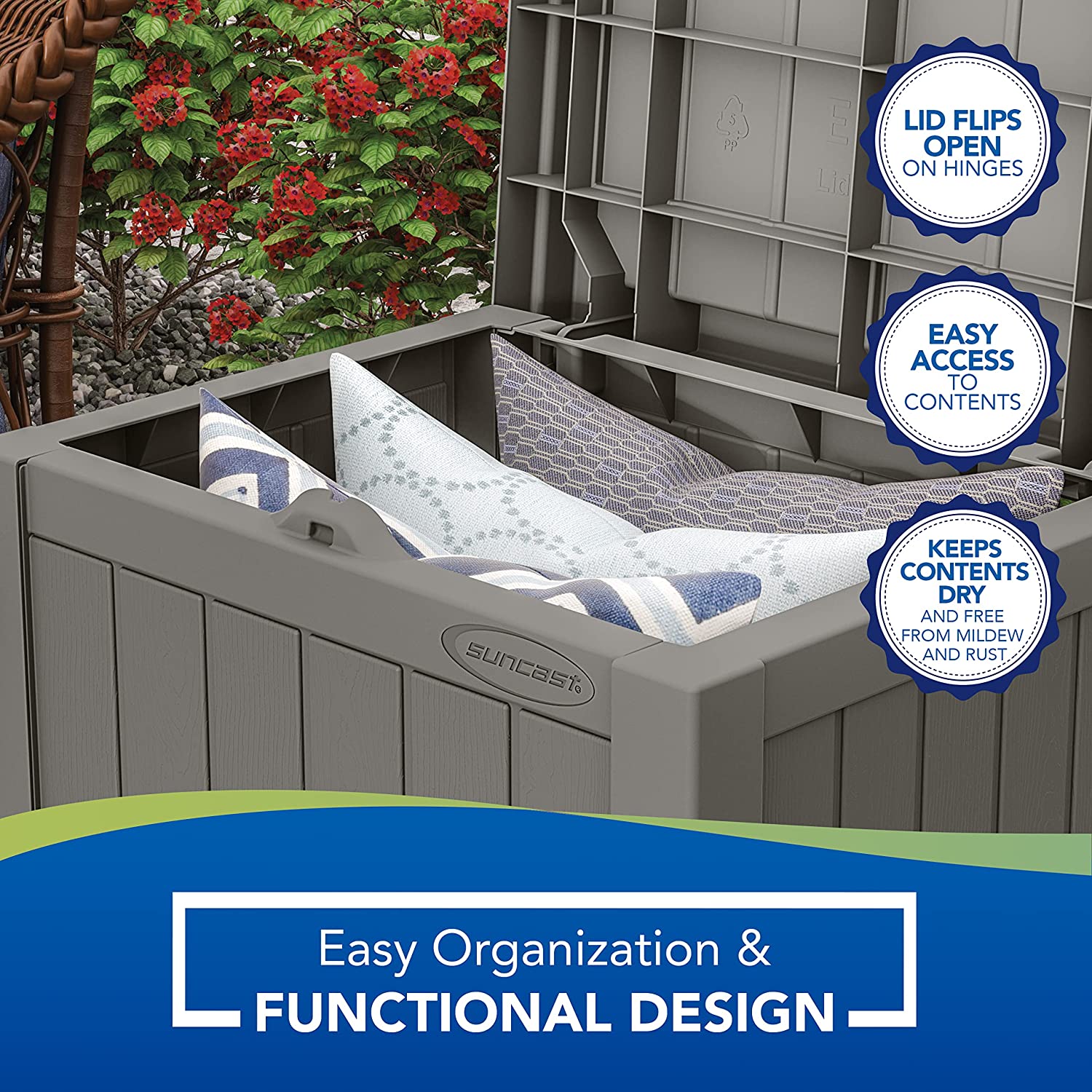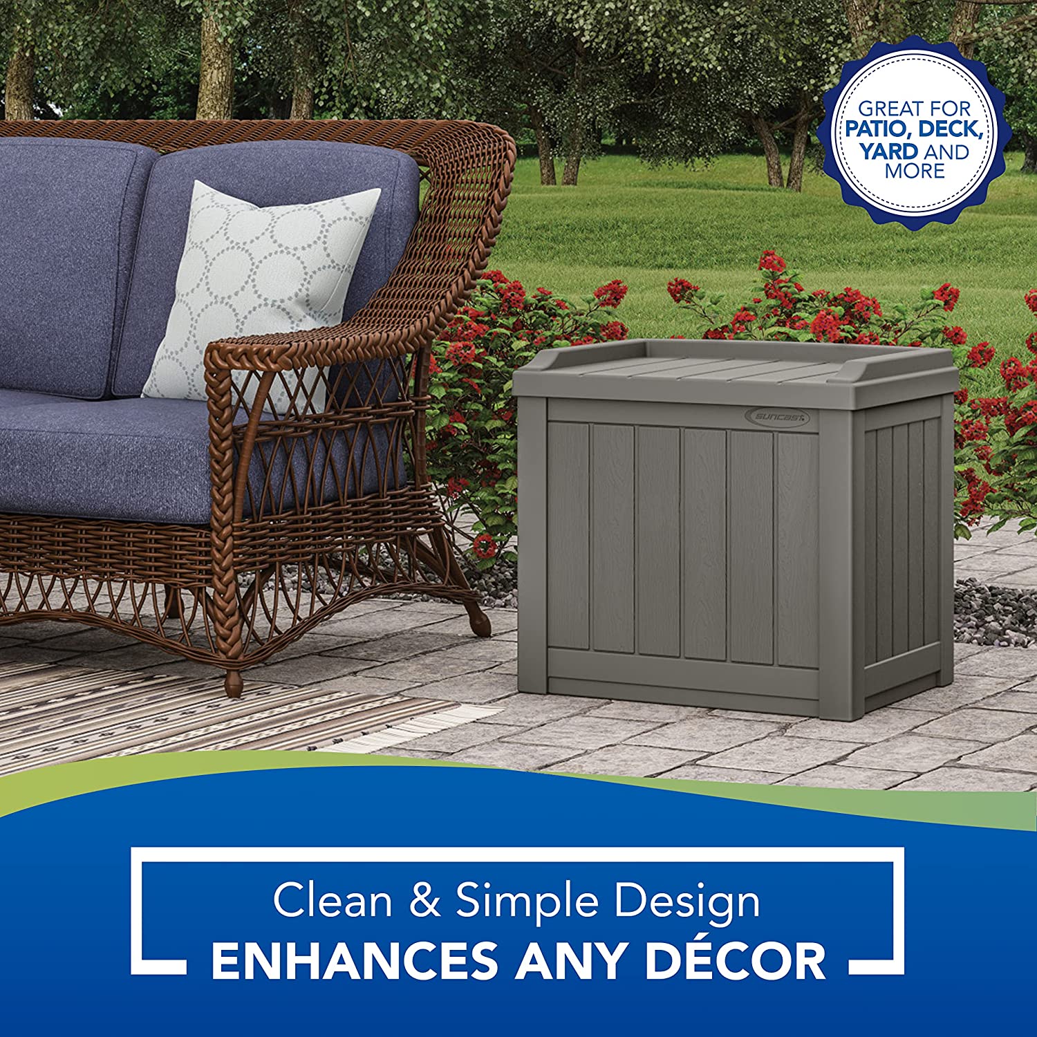 Suncast 22-Gallon Small Deck Box – Lightweight Resin Indoor/Outdoor Storage Container and Seat for Patio Cushions and Gardening Tools – Store Items on Patio, Garage, Yard – Stone Gray