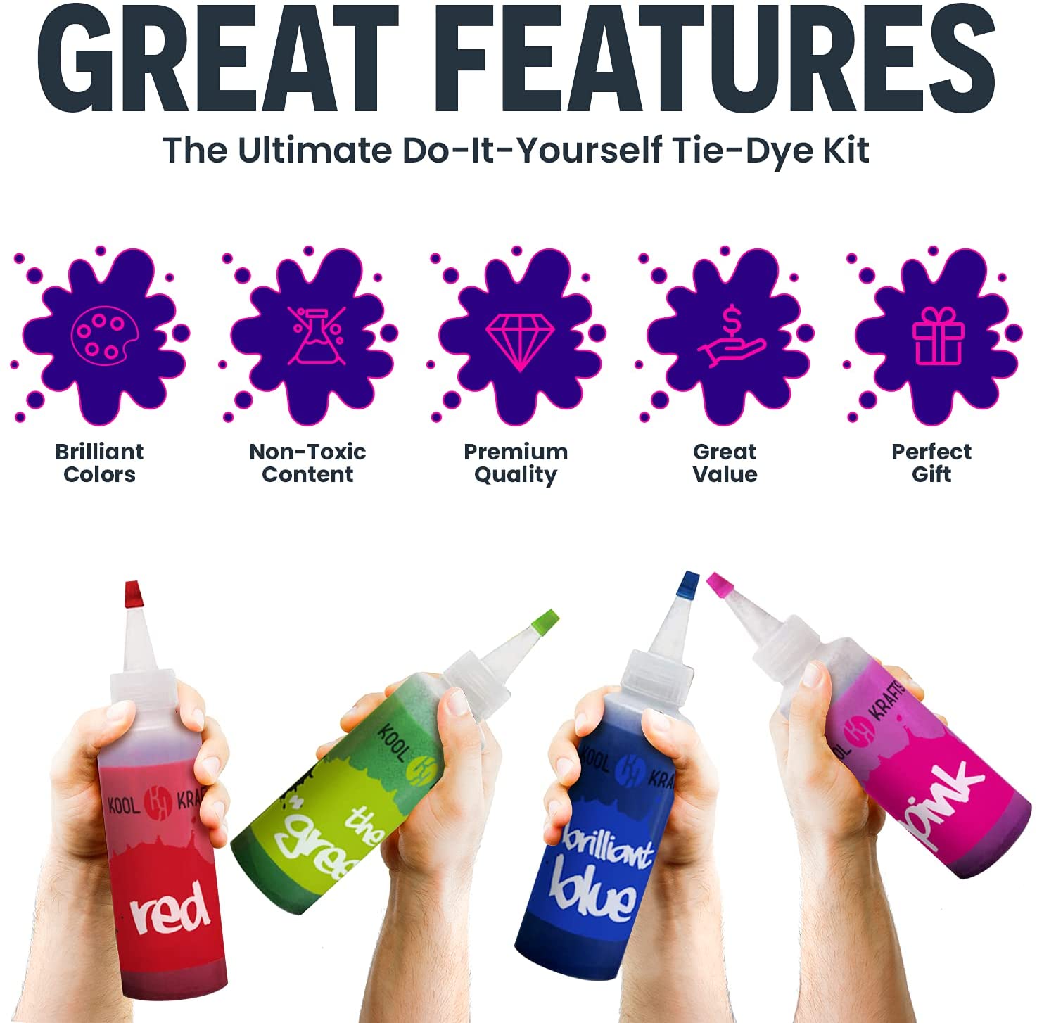 A COMPLETE TIE DYE KIT; Each Box includes: 12 Vibrant Colors Easy squeeze + 4 Cotton White T-Shirt ( Sizes, 2 Small, 1 Medium, 1 Large). It also comes with 12 Disposable Gloves, 90 Rubber bands, 2 Disposable Tablecloths, 1 Instruction Guide with simple step-by-step illustrations. CUTE, FUN, CREATIVE, FOR EVERY AGE: For grownups, some of our fondest memories revolve around the painting as kids; Some of that simpler time can be captured by a little paper folding; the tie-dye technique is a great way for parents to spend quality time with kids without the need for any high tech gadget; Express yourself in creative and imaginative ways with this fun and rewarding hobby! SUPER SAFE DESIGNS: Our products are made with your child’s safety in mind. Great for beginners or kids. Dyes are permanent, regular machine washes and stays bright after washes. Our tie dyes are non-toxic and acid-free. 100% satisfaction guaranteed Love it, or your money back! EASY TO CREATE: In just a few steps with the colored Instructions that are included, you’re on your way to making stunning crafts to share with everyone! First choose any of the techniques from the dye guide, Endless possibilities! create your desired design, and then share them with your friends and family A LOVELY GIFT FOR ANY CHILD: The best feeling for any kid is receiving a present they know they’ll enjoy! Deliver this gift of artful inspiration and creativity to any boy or girl for birthdays, holiday events, school prize, or a reward for a job well done