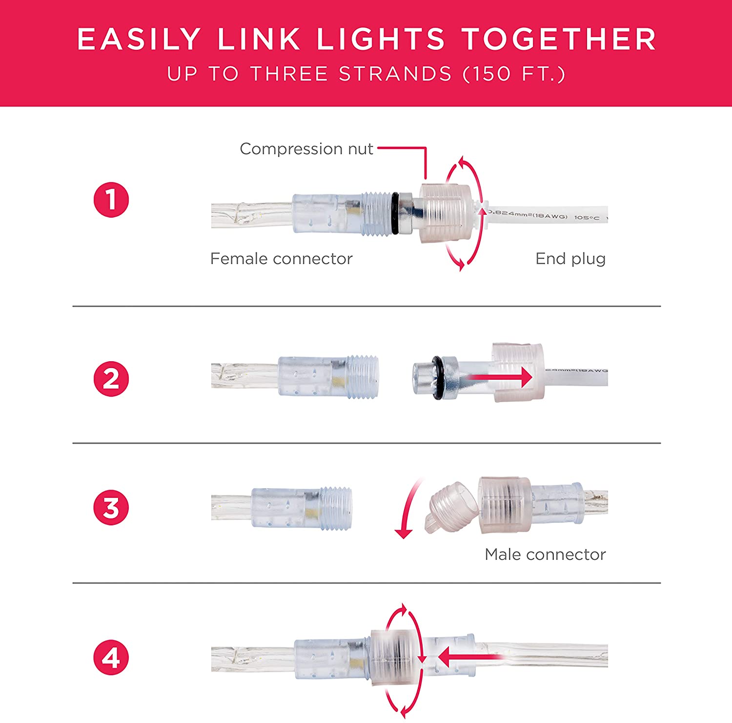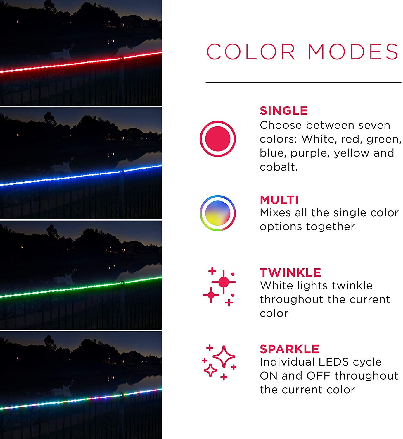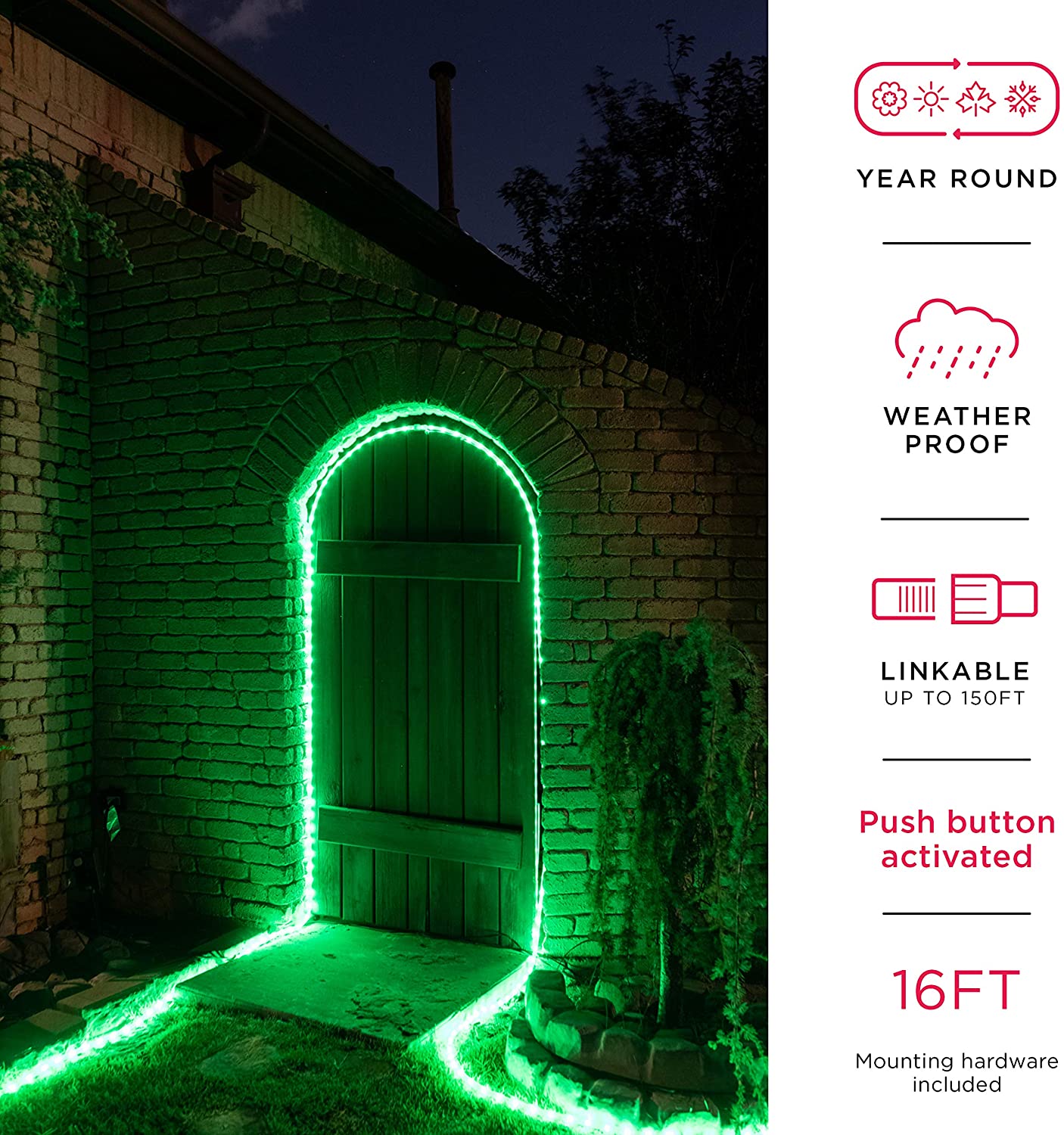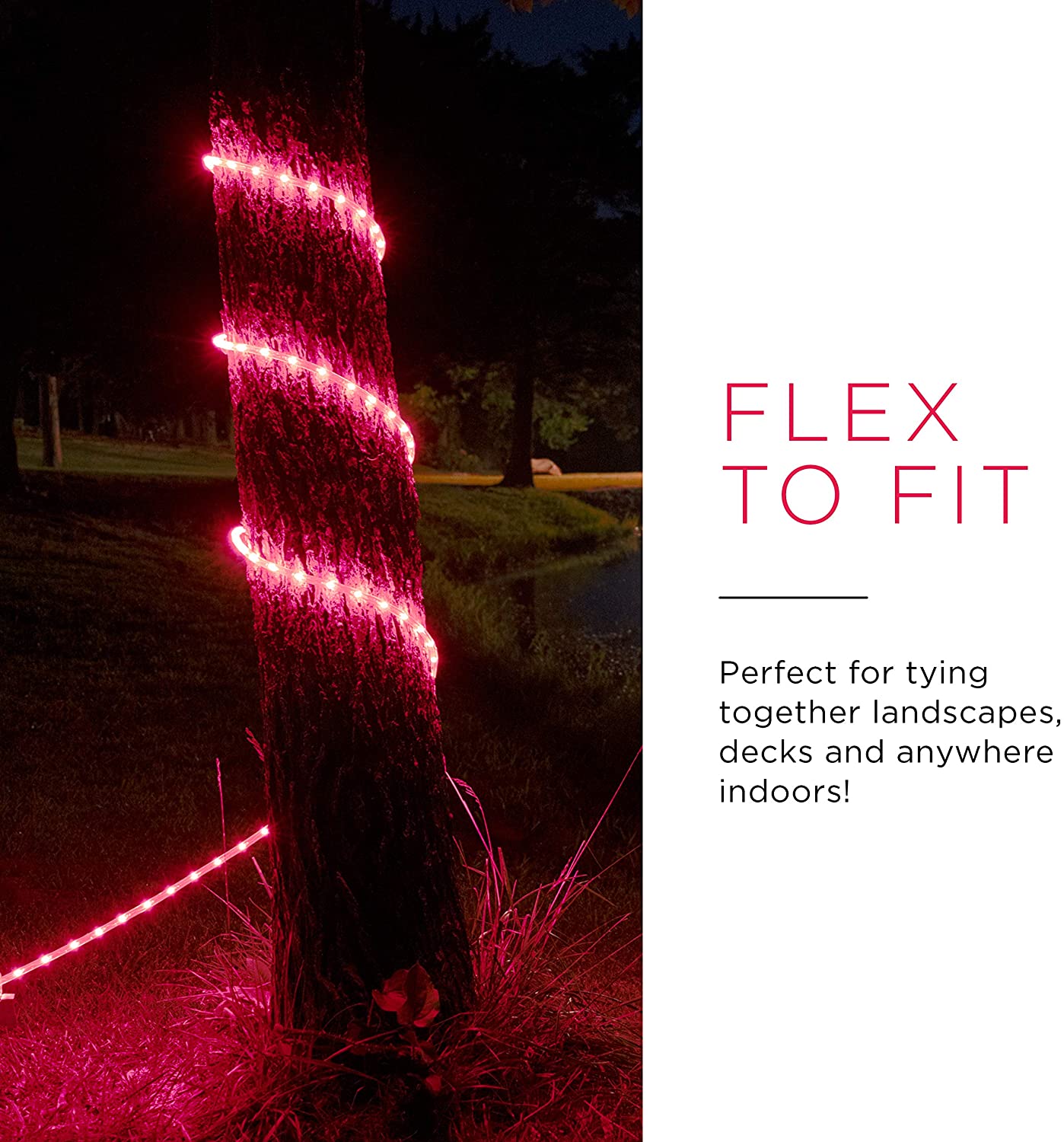 Adjustable Lighting – Flexible rope design offers color-changing illumination with a stylish personal touch — perfect for customizing any outdoor or indoor location Dynamic Colors – Use the attached mode-select button to choose your favorite single color (white, red, green, blue, purple, yellow or cobalt) and enhance the atmosphere with modes like multi-color rainbow, twinkle or sparkle Easy Installation – All mounting hardware comes in the box — wrap around trees, line landscapes, hang on decks and balconies or even install indoors Linkable – Combine additional sets for up to 150ft. of light — available in lengths of 16ft. (54507), 25ft. (54508) and 50ft. (54509) Created to Last – This UltraPro product features a durable design and is ETL-rated for any indoor or outdoor environment