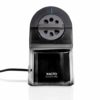 - Electric pencil sharpener with SafeStart motor stops shaving when the bin is removed